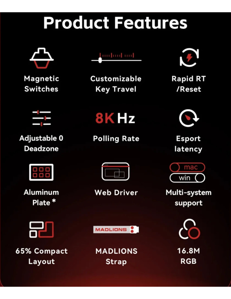 | ДОПЪЛНИТЕЛНИ | 8K Polling Rate 16.8M RGB Adjustable 0 Deadzone Customizable Key Travel Esport Latency Madlions Strap Rapid RT Reset |