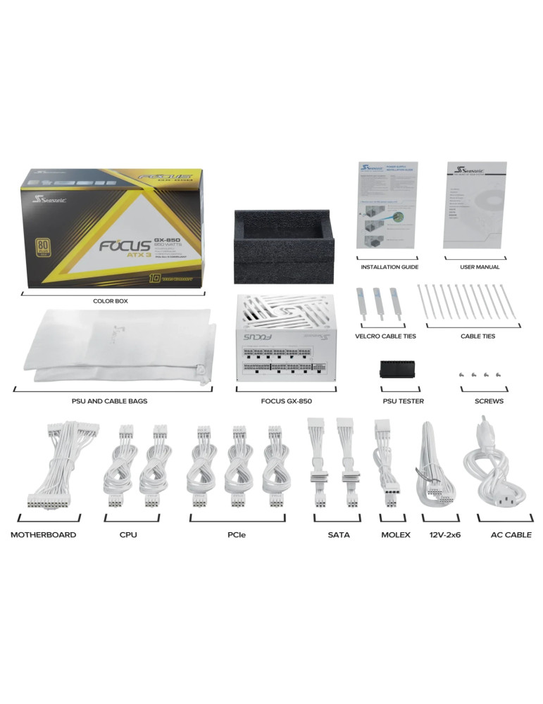 Модулно захранване Seasonic 850W Gold, ATX 3.1, PCIe 5.1 - FOCUS-GX-850-V4-WHITE