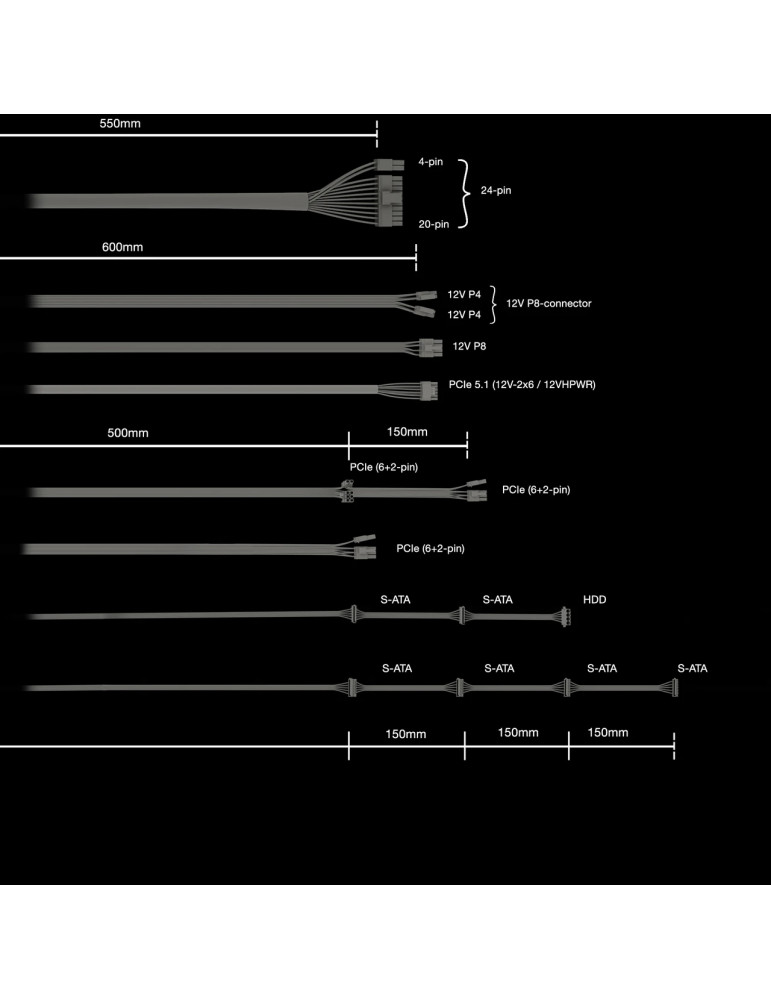 | ДРУГИ | 80 PLUS® Gold efficiency (up to 92.9%) ATX 3.1 PSU with full support for PCIe 5.1 GPUs and GPUs with 6+2 pin connectors Advanced stability and voltage regulation thanks to LLC technology One PCIe 5.1 12V-2x6 600W and 3 PCIe 6+2 connectors for overclocked high-end GPUs One massive high-performance 12V-rail |