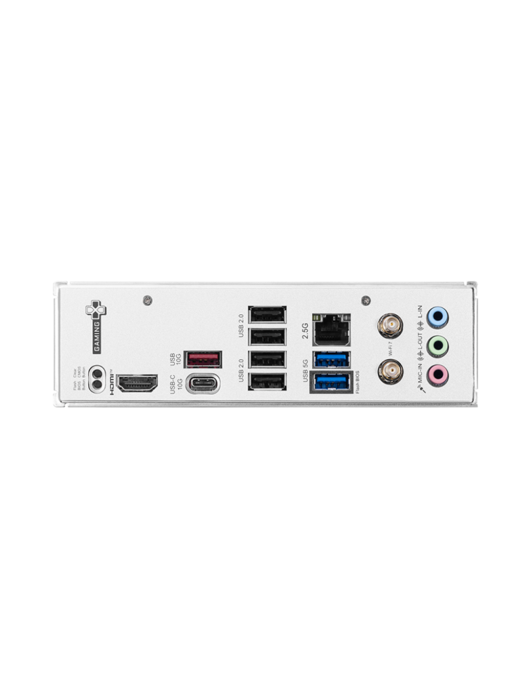 • Interface: Clear CMOS Button;USB 10Gbps (Type-A);USB 2.0;2.5G LAN;Wi-Fi / Bluetooth;Audio connectors;Flash BIOS Button;HDMI™ 2.1 Port;USB 10Gbps (Type-C);USB 5Gbps (Type-A)