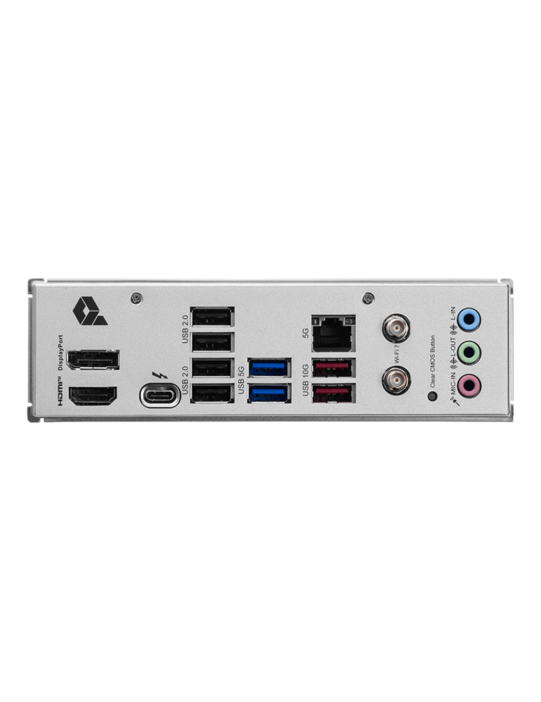 • I/O: 1x Thunderbolt4 ports (Rear);Supports up to 40Gbps transfer rate with Thunderbolt devices;Supports up to 20Gbps transfer rate with USB4 devices;Supports up to 10Gbps transfer rate with USB 3.2 devices;Supports up to 5V/3A,15W power charging;Each port can daisy-chain up to three Thunderbolt 4 devices or five Thunderbolt 3 devices;Supports up to 8K display;4x USB 2.0 (Rear);4x USB 2.0 (Front);2x USB 5Gbps Type A (Rear);4x USB 5Gbps Type A (Front);2x USB 10Gbps Type A (Rear);1x USB 10Gbps Type C (Front);• DisplayPort;• USB 2.0;• USB 5Gbps Type-A;• 5G LAN;• Wi-Fi / Bluetooth;• Audio Connectors;• HDMI™;• Thunderbolt™ 4 40Gbps (Type-C);• USB 10Gbps Type-A;• Clear CMOS Button