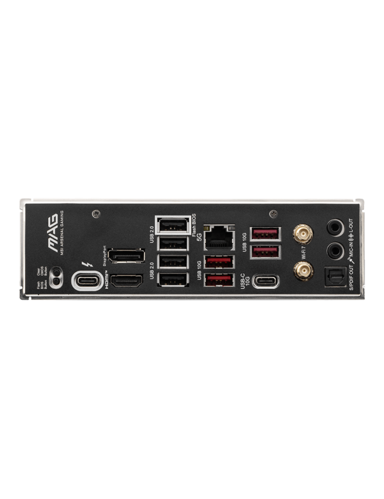 • I/O: Thunderbolt Resource CPU;1x Thunderbolt4 ports (Rear);Supports up to 40Gbps transfer rate with Thunderbolt devices;Supports up to 20Gbps transfer rate with USB4 devices;Supports up to 10Gbps transfer rate with USB 3.2 devices;Supports up to 5V/3A,15W power charging;Each port can daisy-chain up to three Thunderbolt 4 devices or five Thunderbolt 3 devices;Supports up to 8K display;4x USB 2.0 (Rear);4x USB 2.0 (Front);2x USB 5Gbps Type A (Front);4x USB 10Gbps Type A (Rear);1x USB 10Gbps Type C (Rear);1x USB 10Gbps Type C (Front);1x USB 40Gbps Type C (Rear);• Clear CMOS Button;• DisplayPort;• USB 2.0 (Flash BIOS Port);• 5G LAN;• USB 10Gbps Type-A;• Audio Connectors;• Flash BIOS Button;• Thunderbolt™ 4 40Gbps (Type-C);• HDMI™;• USB 2.0;• USB 10Gbps Type-A;• USB 10Gbps Type-C;• Wi-Fi / Bluetooth;• S/PDIF-OUT