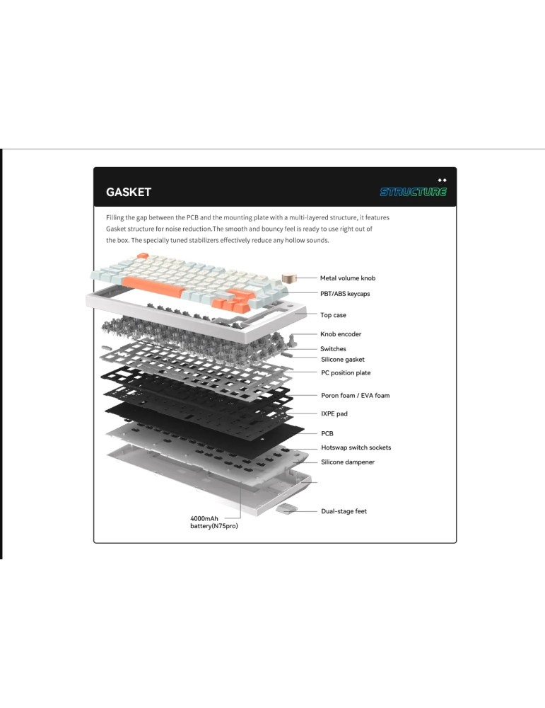 | ДОПЪЛНИТЕЛНИ | 16.8M RGB Backlight Full-Key Hot-Swappable Switch Sockets Gasket structure for noise reduction Metal Volume Knob Poron Foam |