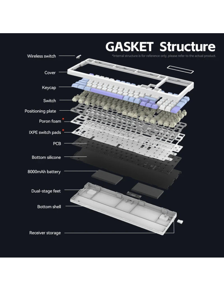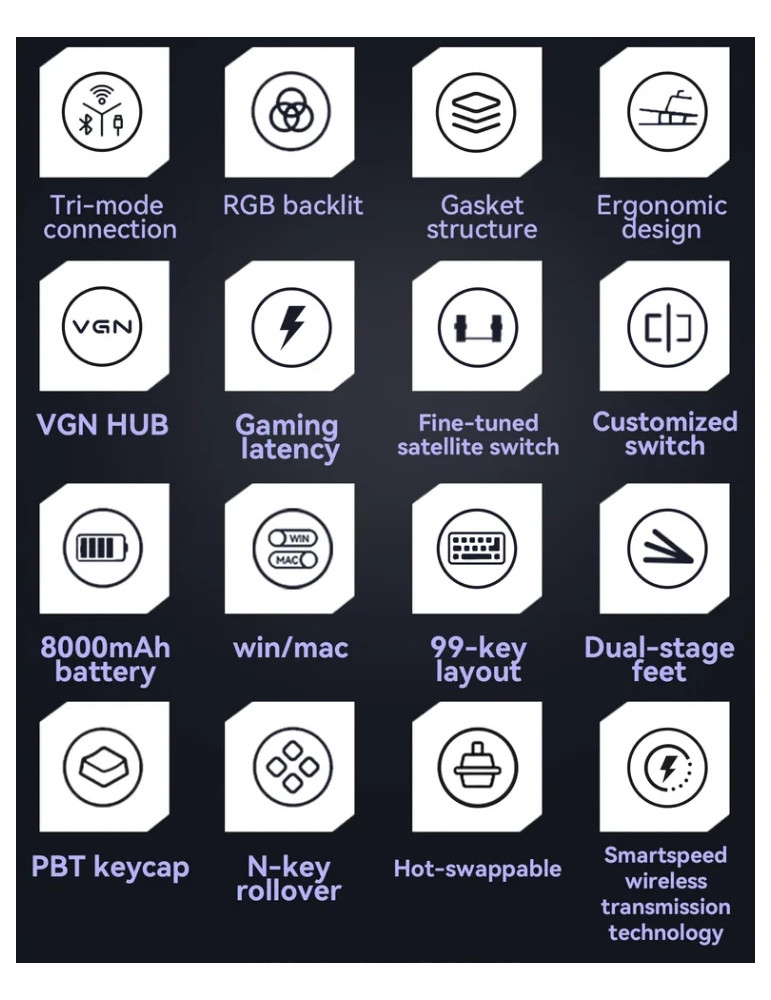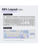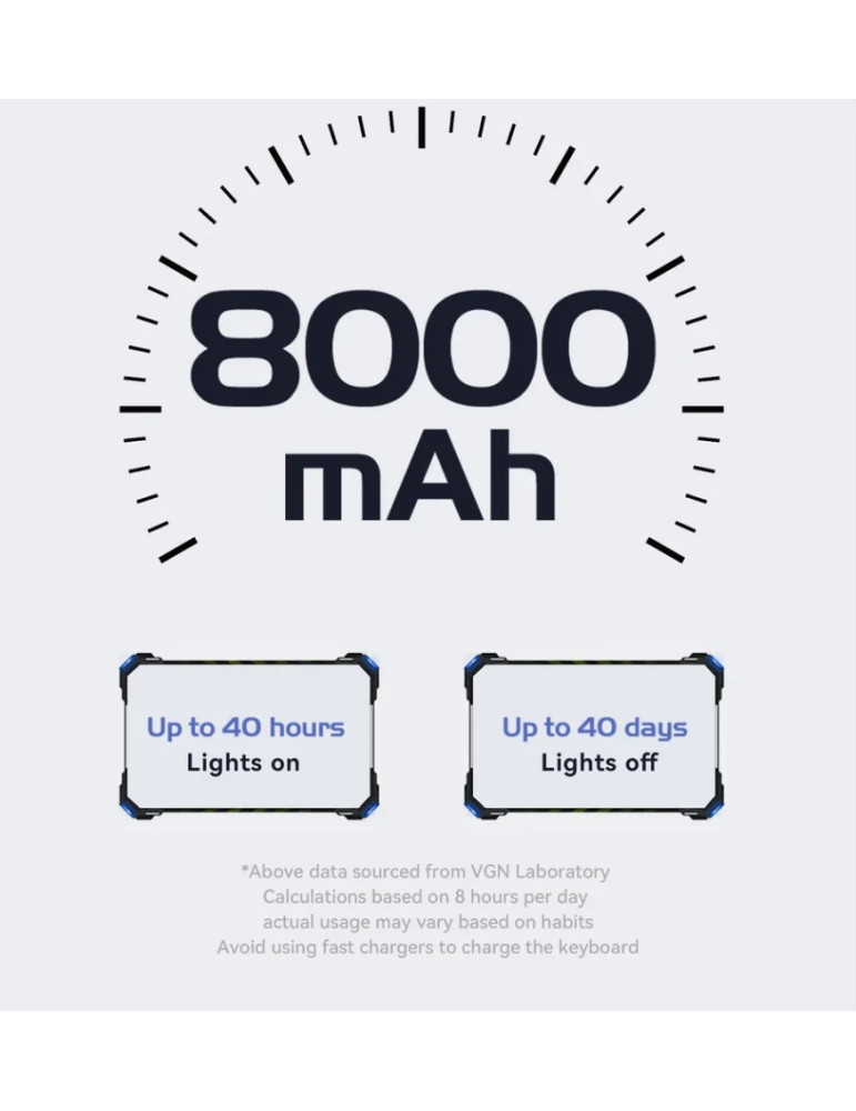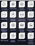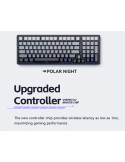 | ДОПЪЛНИТЕЛНИ | 2.4G/Bluetooth 5.0/Wired (USB-C) 16.8M RGB 8000 mAh battery Customized switches Gasket Structure Hot-Swappable Switches PBT keycap Three spare switches (included) |