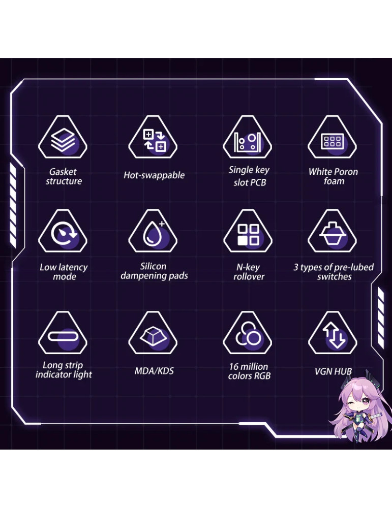 | ДОПЪЛНИТЕЛНИ | 16.8M RGB 8000 mAh battery Gasket Structure Hot-Swappable Switches Low latency mode N-Key rollover Silicone dampening pads Single key slot PCB White Poron foam |