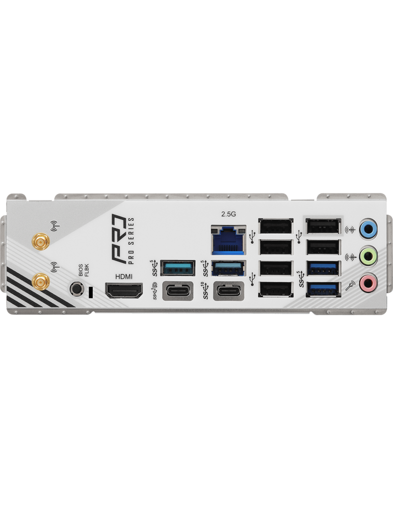 • I/O: 2 x Antenna Ports;1 x HDMI Port;1 x USB 3.2 Gen2 Type-C Port (10 Gb/s);1 x USB 3.2 Gen1 Type-C Port (DP-alt mode supports DP1.4a);4 x USB 3.2 Gen1 Type-A Ports;6 x USB 2.0 Ports;1 x RJ-45 LAN Port;1 x BIOS Flashback Button;HD Audio Jacks: Line in / Front Speaker / Microphone