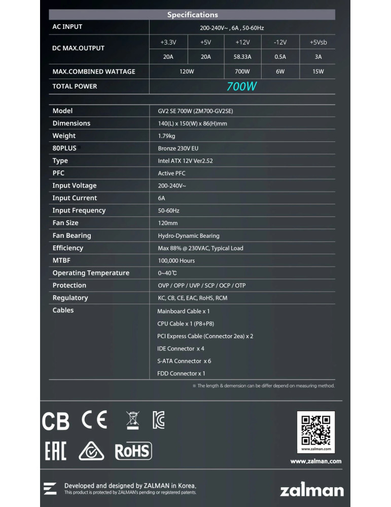 Захранване Zalman 700W Bronze - ZM700-GV2-SE
