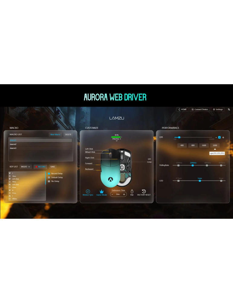 | ДОПЪЛНИТЕЛНИ | AURORA Web Software ENCODER: Lamzu custom Package include : PTFE feet; 8K Dongle; 1.8m Type-c para cord; Velvet bag |