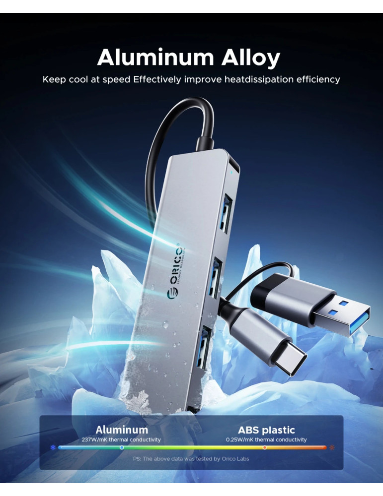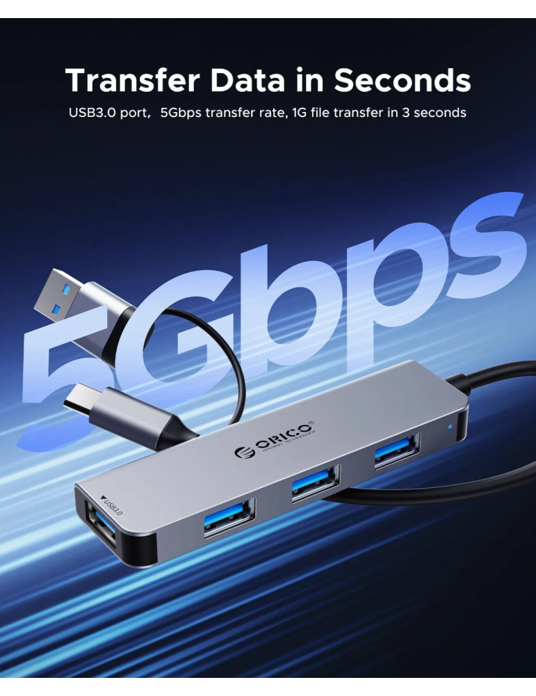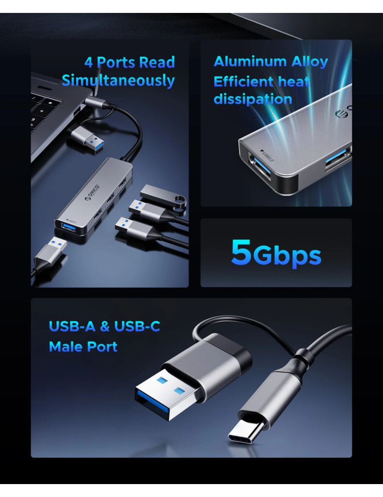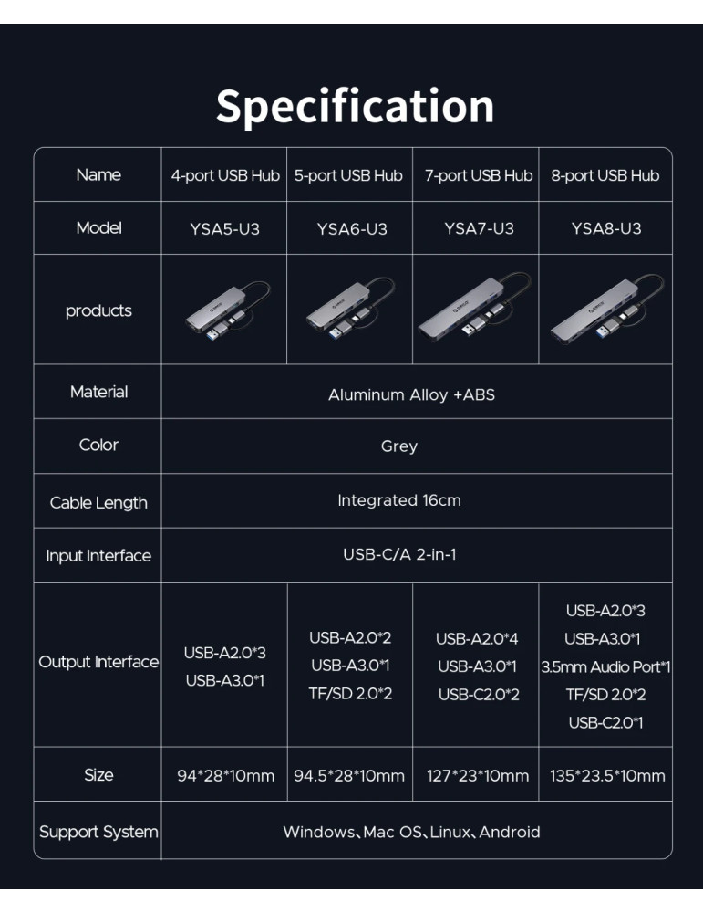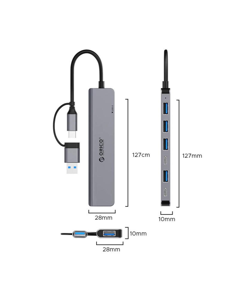 Хъб Orico HUB USB-C/USB-A 7 port - USB-C x 2, USB3.0 x 1, USB2.0 x 4, Aluminium - YSA7-U3-GY