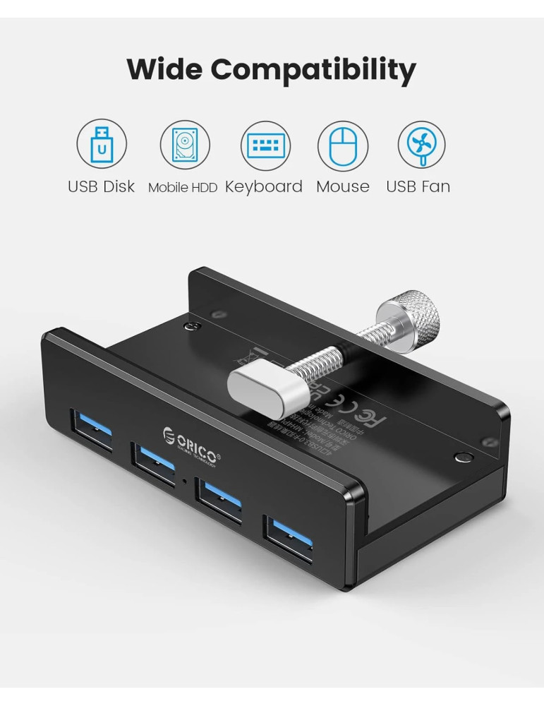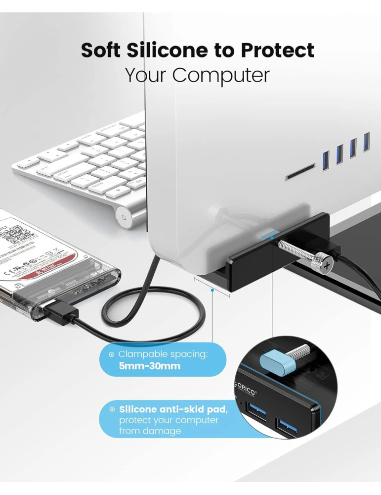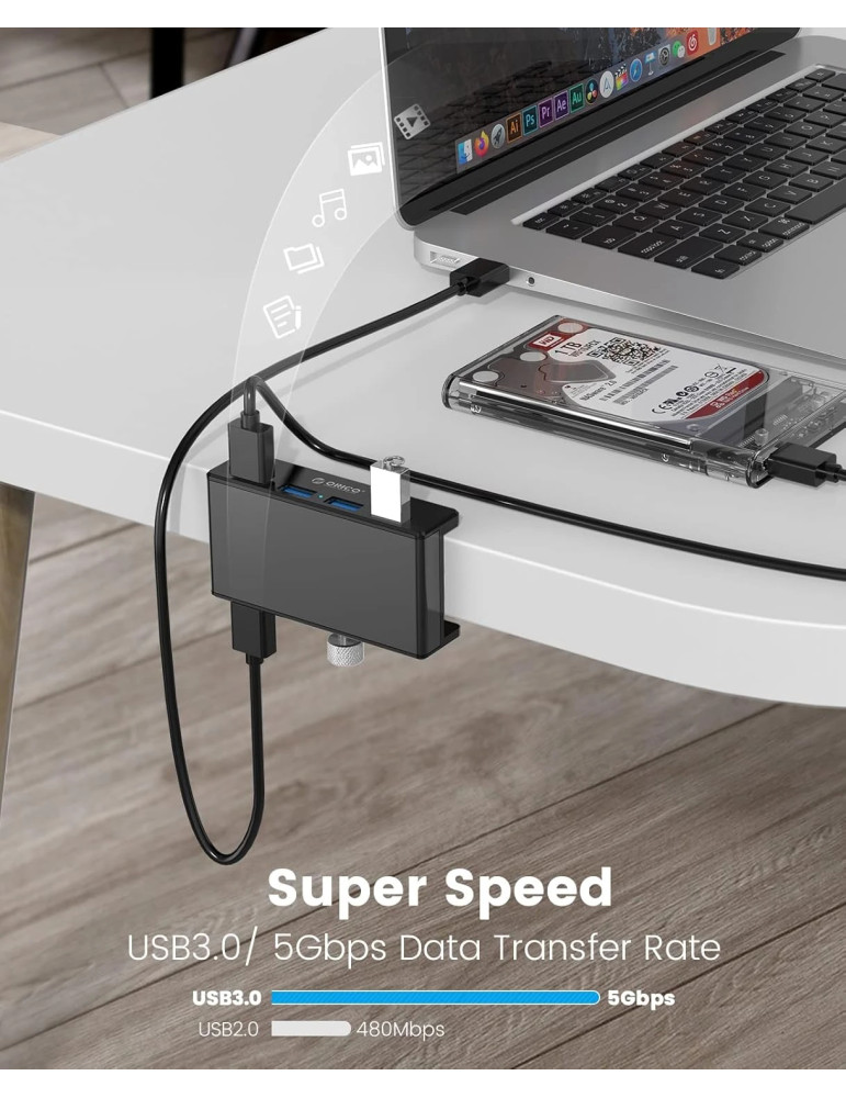 Хъб Orico HUB 3.0 Clip Type 4 port - aux Micro-USB power input, Black - MH4PU-P-BK