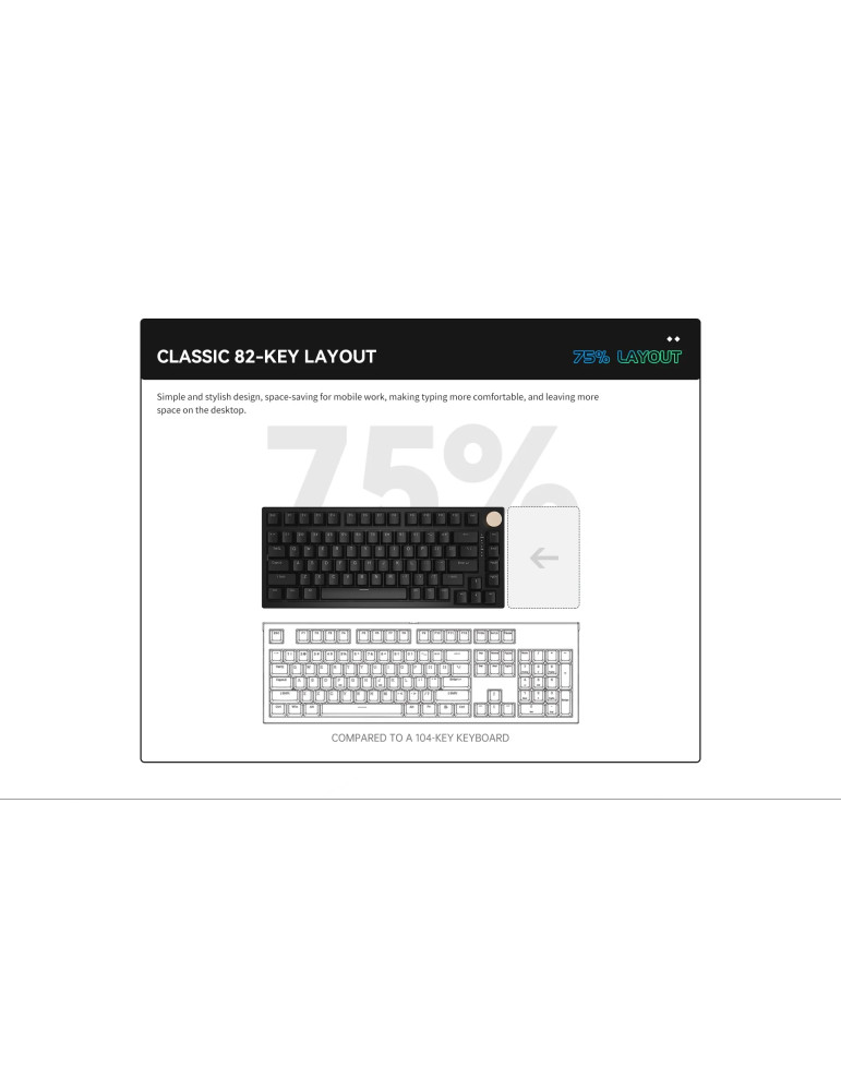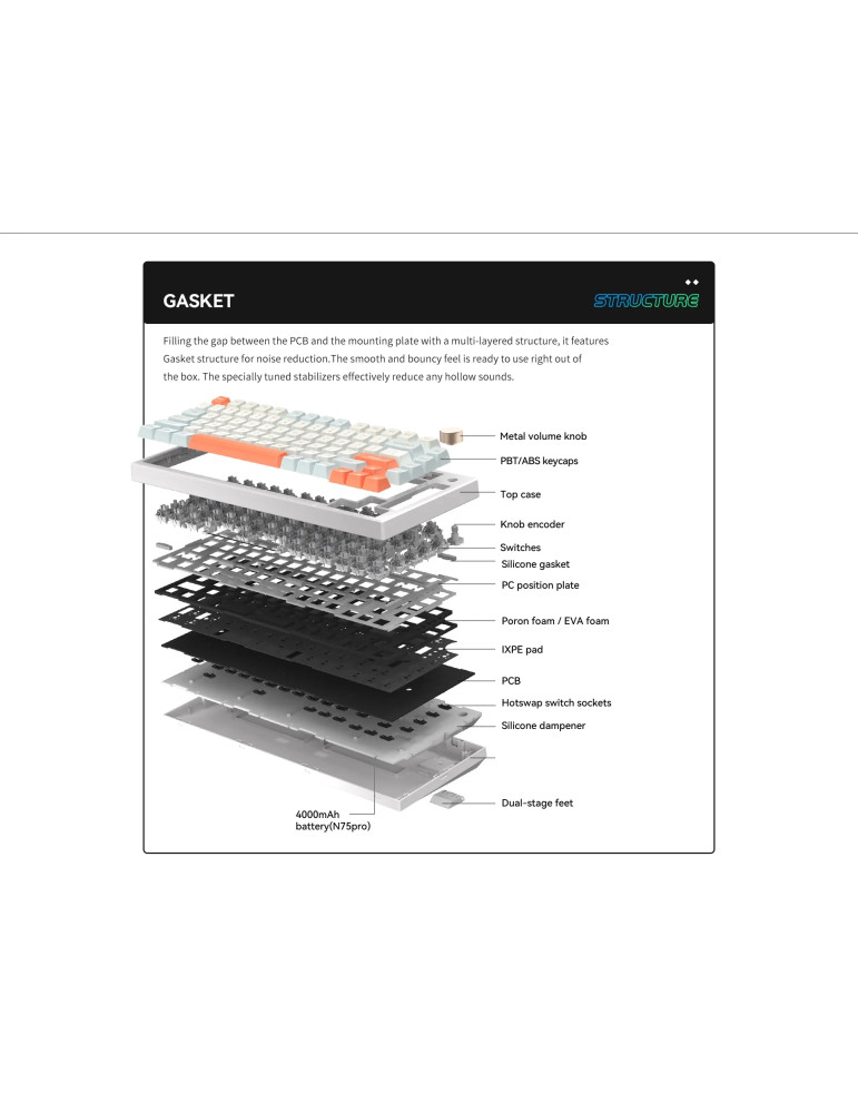 | ДОПЪЛНИТЕЛНИ | Compact 75% mechanical keyboard with a built-in gasket structure design Driver programmable Features a built-in metallic knob N-key rollover PC position plate VGN V1 Stabilizers |