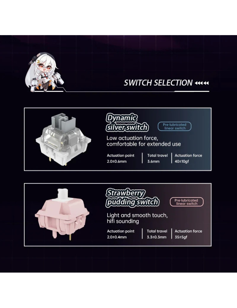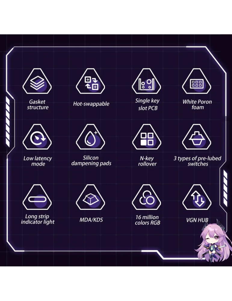 | ДОПЪЛНИТЕЛНИ | 16.8M RGB 4000 mAh battery Gasket Structure Hot-Swappable Switches Low latency mode N-key rollover Silicone dampening pads Single key slot PCB White Poron foam |