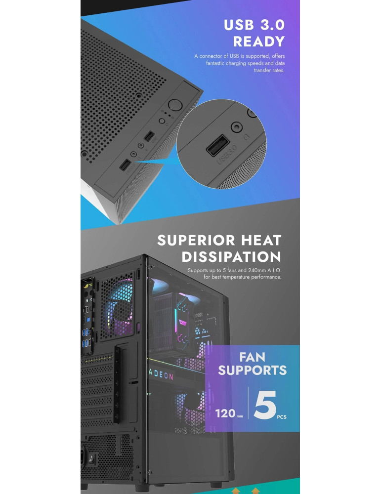 | ДОПЪЛНИТЕЛНИ | 3 RGB Fans included Detaching Dust Filter Front Mesh Panel Tempered Glass |