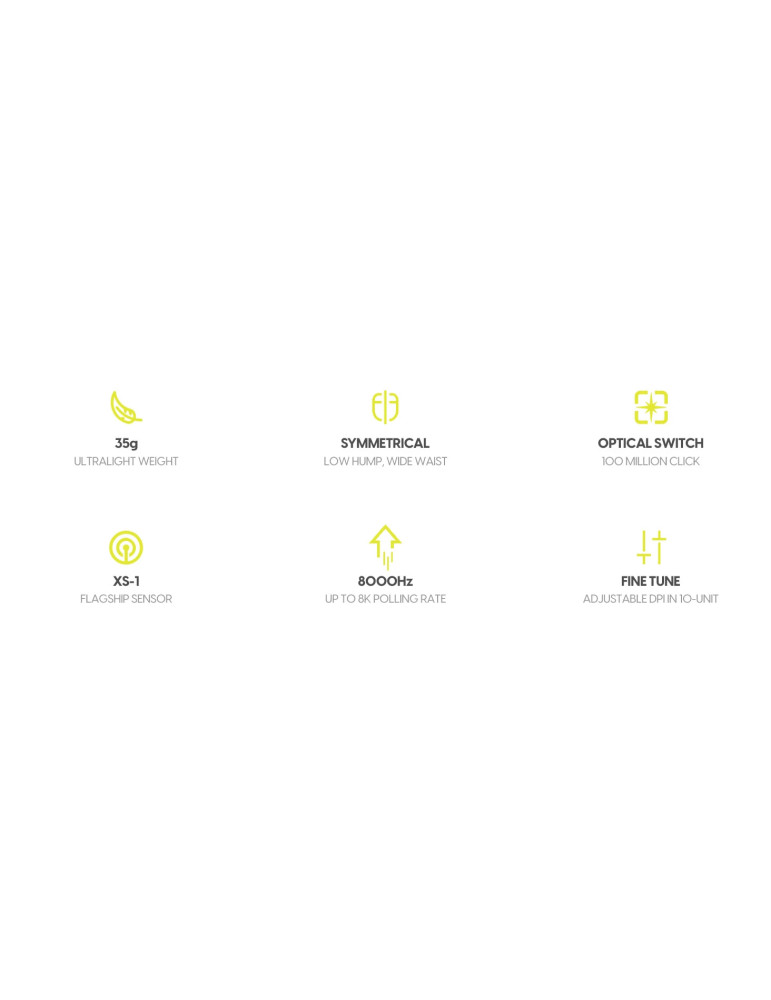 | ДОПЪЛНИТЕЛНИ | Durable 100 million click lifespan with Pulsar Optical Switch for consistent performance Equipped with the XS-1 flagship sensor for pinpoint accuracy and reliable performance Incredibly lightweight at just 35g, reducing hand fatigue and improving speed Optimized for Claw and fingertip grip players, offering precision and agility Perfectly balanced low hump and wide waist for enhanced comfort and control during intense gaming sessions Symmetrical shape ensures ambidextrous use and versatile grip styles |