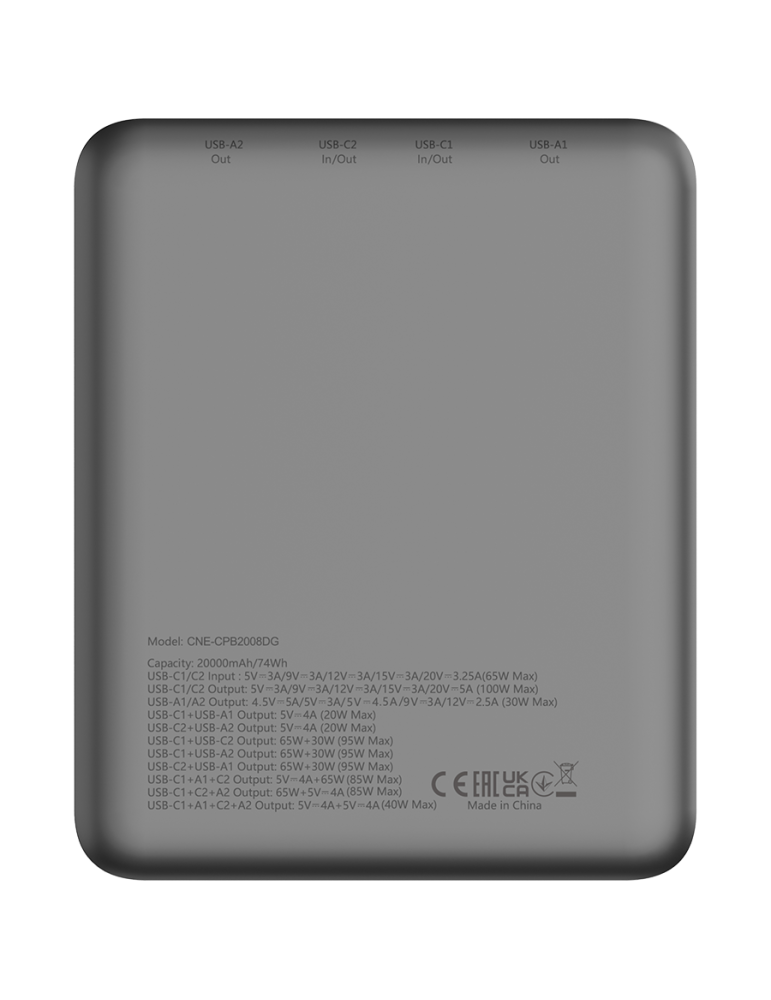 | Търговско име | CANYON power bank PB-2008 LED FLAT 20000 mAh PD100W QC3.0 Dark Grey |