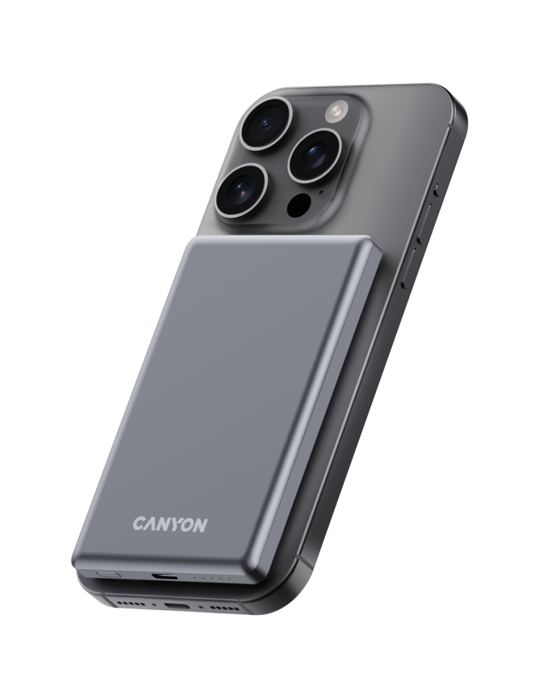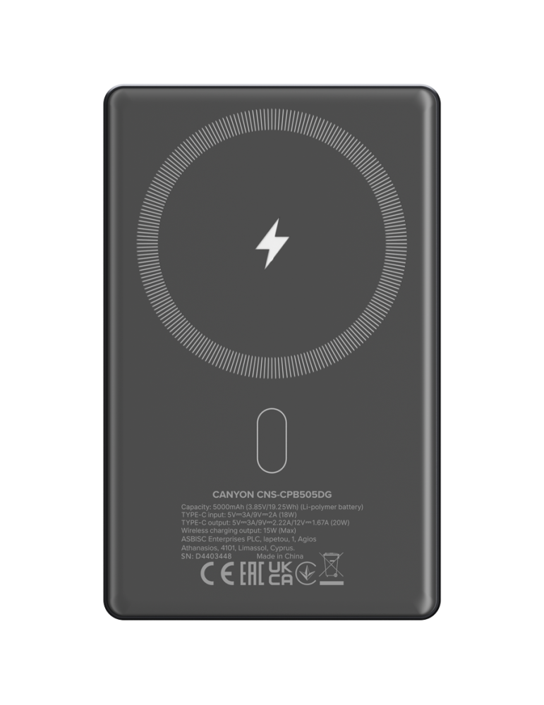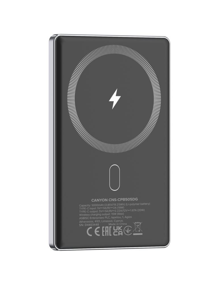 | Търговско име | CANYON power bank OnPower 505 slim Magsafe 5000 mAh PD20W Dark Grey |