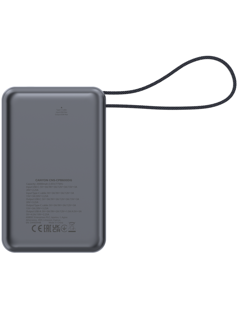 | Търговско име | CANYON power bank OnPower 600 built-in cable 20000 mAh PD65W Dark Grey |