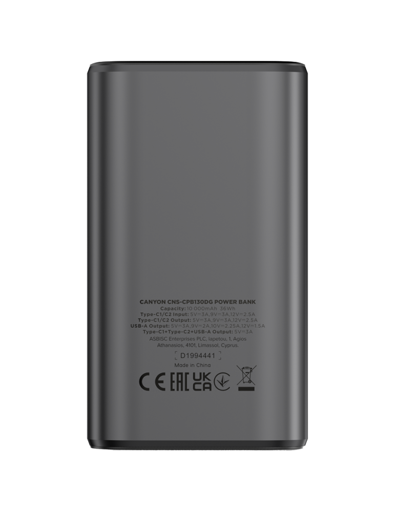 | Търговско име | CANYON power bank OnPower 130 TFT 10000 mAh PD30W Dark Grey |
