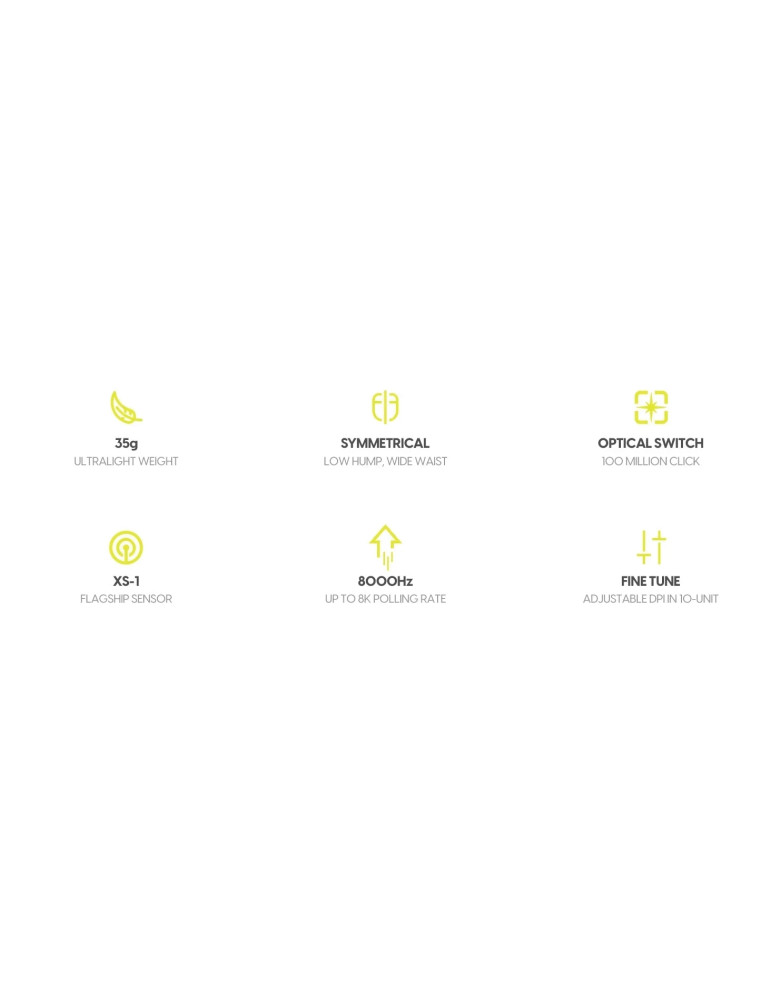 | ДОПЪЛНИТЕЛНИ | Durable 100 million click lifespan with Pulsar Optical Switch for consistent performance Equipped with the XS-1 flagship sensor for pinpoint accuracy and reliable performance Incredibly lightweight at just 35g, reducing hand fatigue and improving speed Optimized for Claw and fingertip grip players, offering precision and agility Perfectly balanced low hump and wide waist for enhanced comfort and control during intense gaming sessions Symmetrical shape ensures ambidextrous use and versatile grip styles |