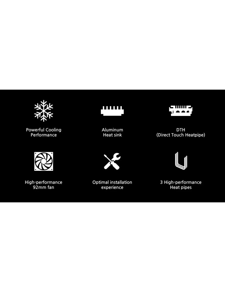 | ДОПЪЛНИТЕЛНИ | 92mm high-performance fan with PWM function Aluminum heat sink designed for precise and efficient airflow Electrophoretic coating Process Maximizing heat transfer through DTH(Direct Touch Heatpipe) technology Optimized for powerful cooling performance Variety of PC case compatibility provide great install experience |