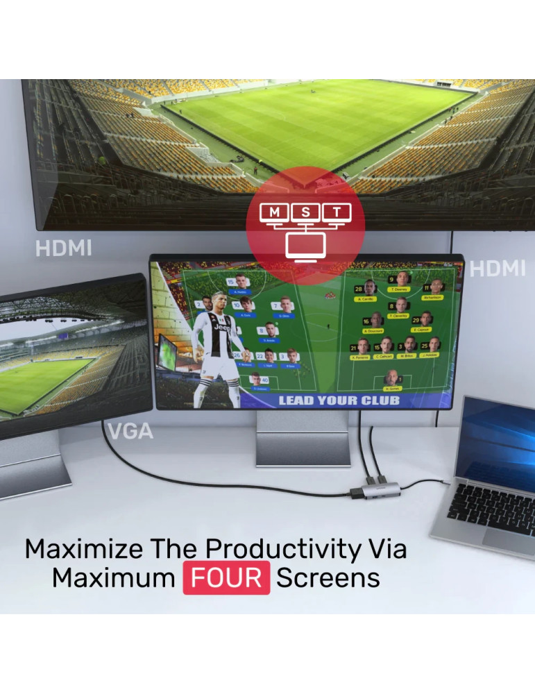 | ДОПЪЛНИТЕЛНИ | HDMI with Ultra-HD (UHD) 4K@30Hz, and VGA with Full HD 1080p@60Hz Material: Aluminium-alloy Housing Streaming 3 independent screens via Multi-Stream Transport (MST) USB-C Power Delivery 100W charging USB expansion with USB3.0 5Gbps SuperSpeed |