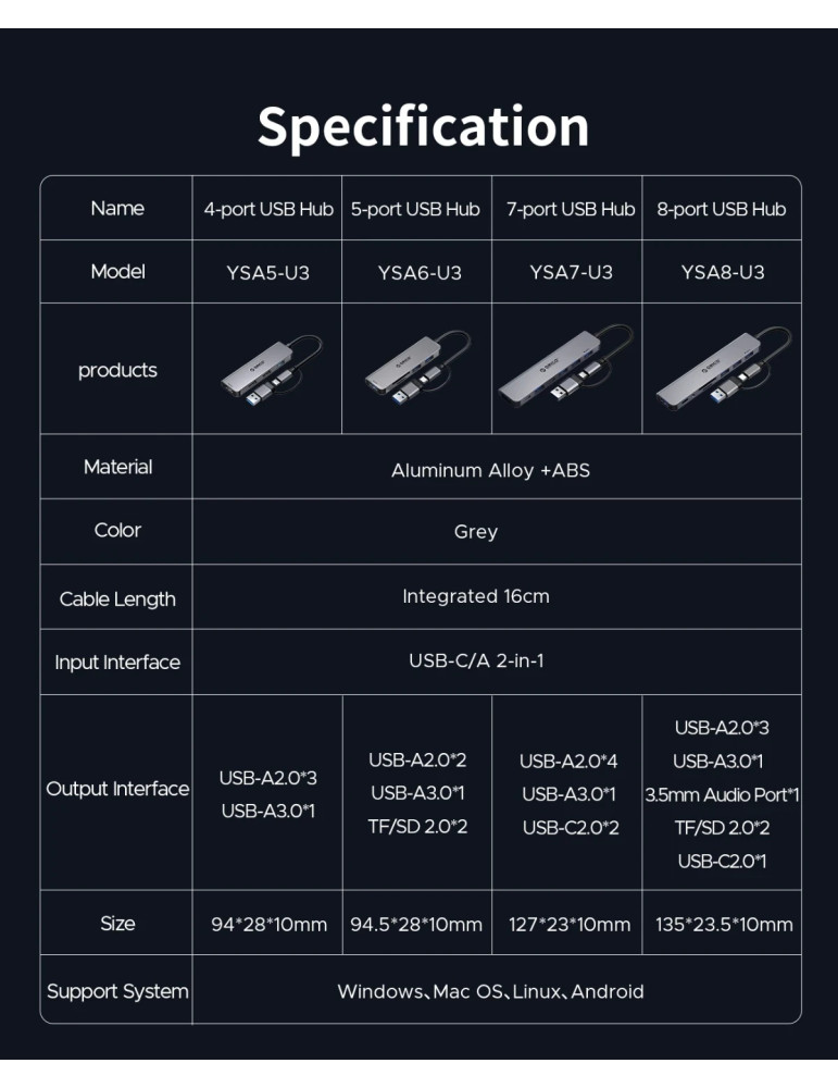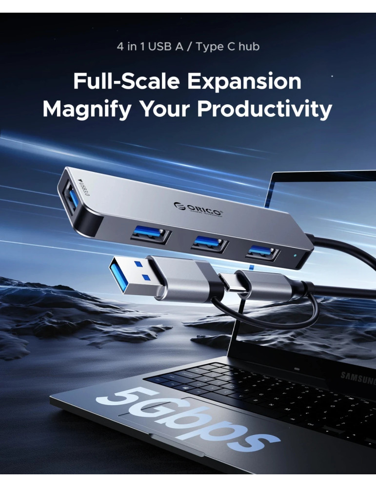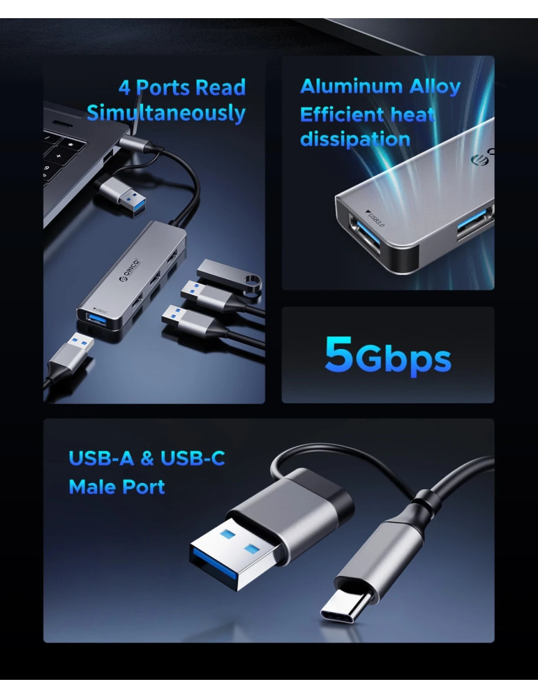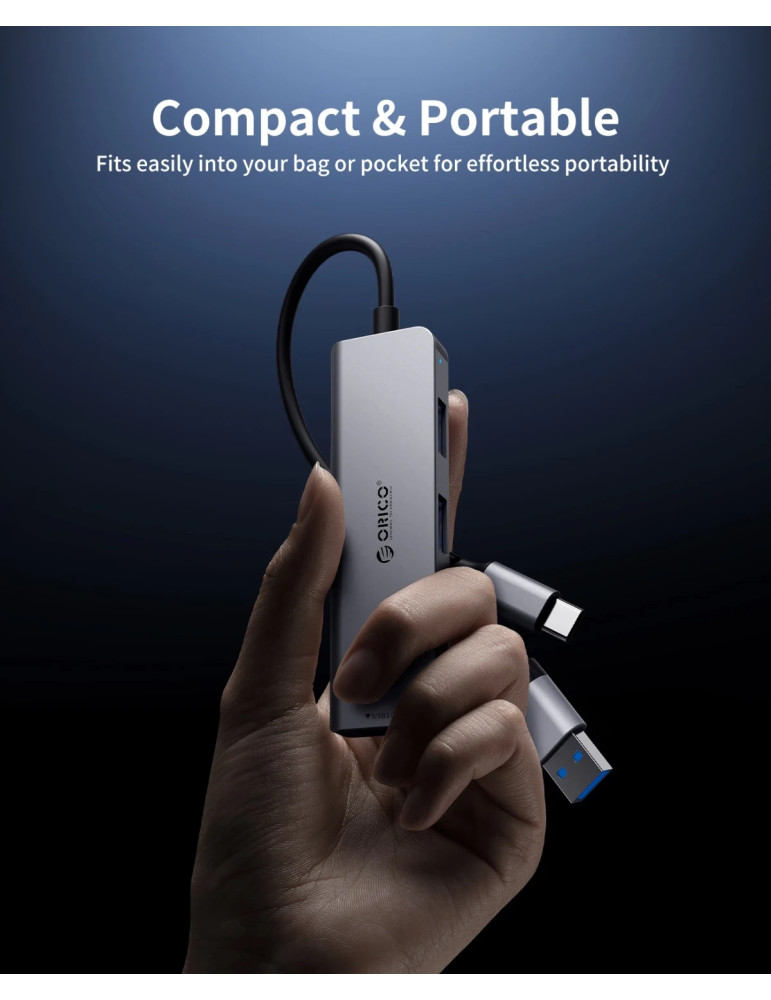 Хъб Orico USB-C/A 4 port - USB3.0 x 1, SD/TF x 2, USB2.0 x 2, USB-C x 2, Aluminium - YSA6-U3-GY - YSA6-U3-GY-BP
