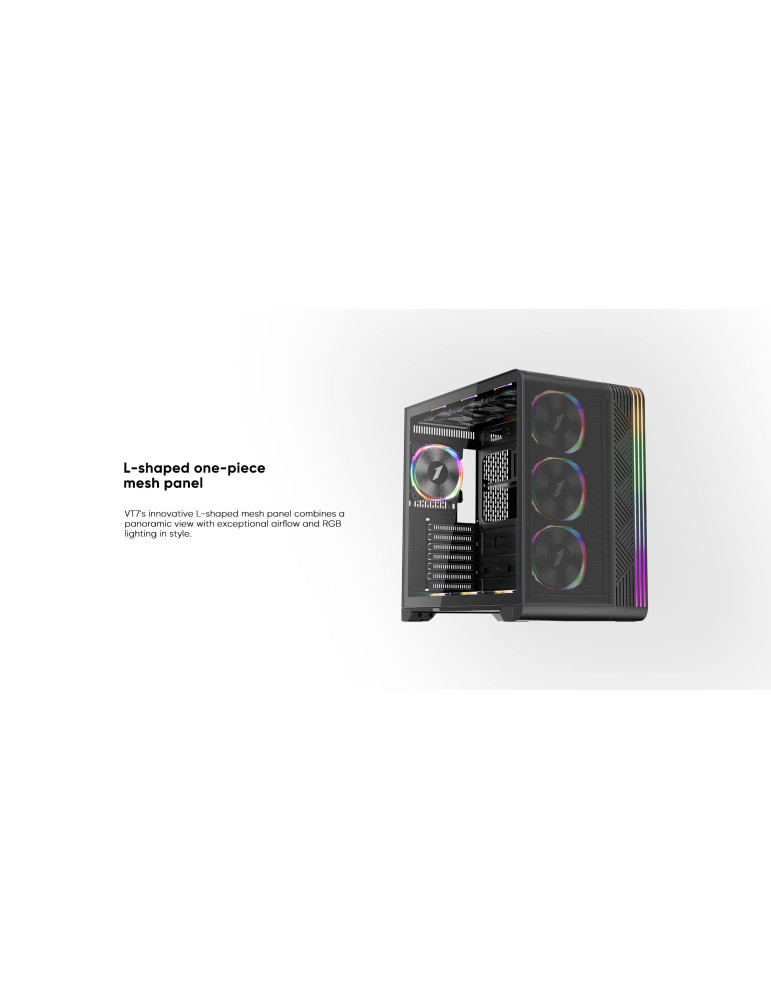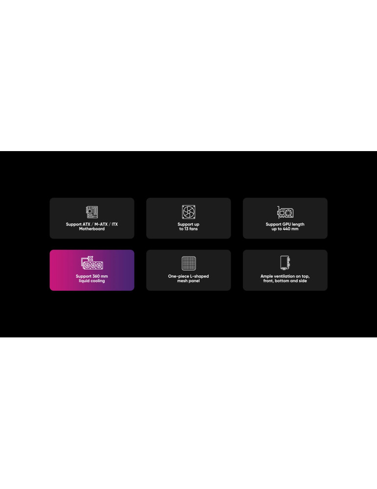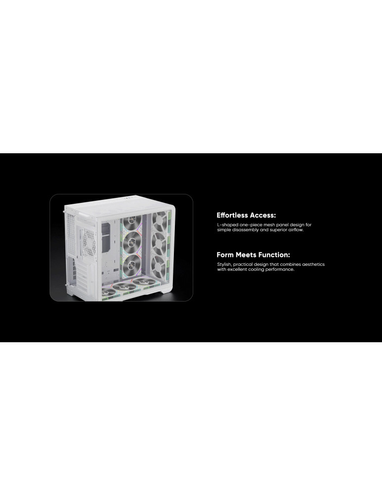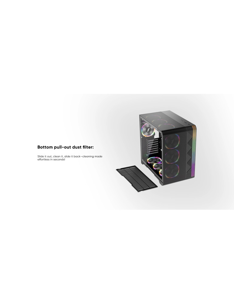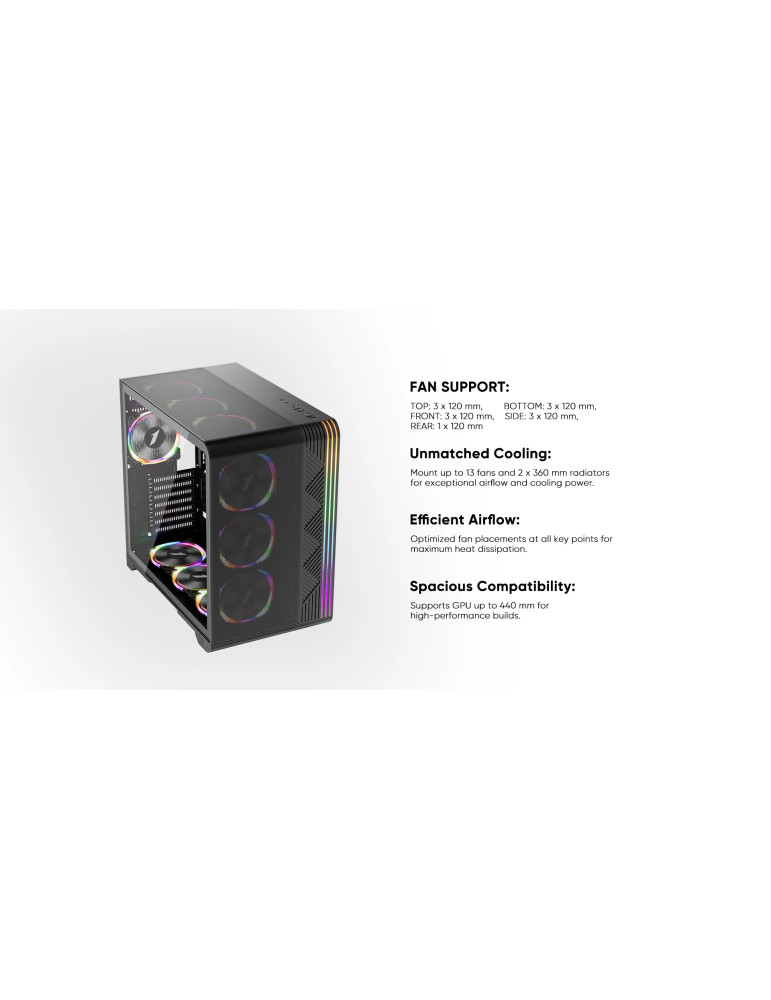 | ДОПЪЛНИТЕЛНИ | Bottom pull-out dust filter Customizable A-RGB light strips One-piece L-shaped mesh panel Supports up to 13 fans |