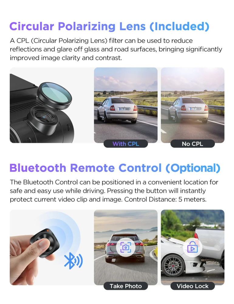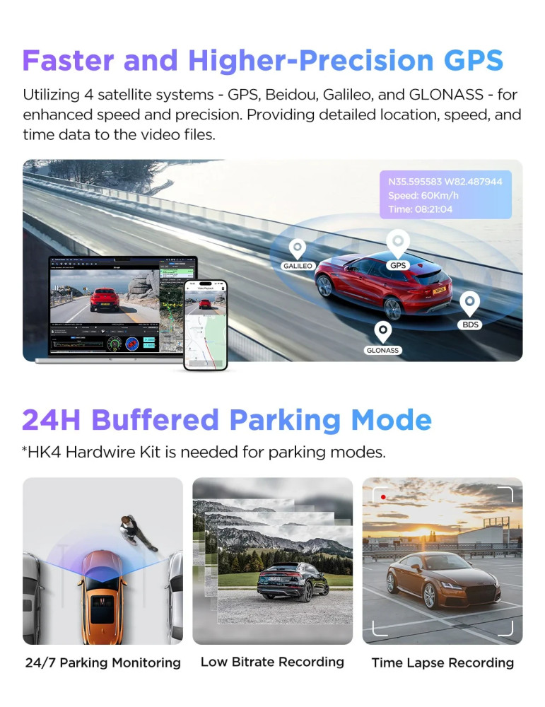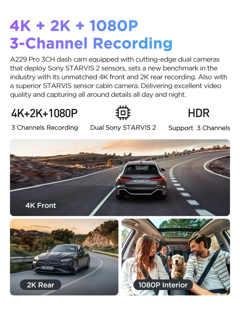 | ДРУГИ | 4K + 2K + 1080p (3 cameras included) Advanced Parking Mode Parking Mode: 24/7 Peace of Mind USB 2.0 Port Ultra-Precise GPS Ultra Fast 5GHz Wi-Fi Up to external 512GB microSD Card |