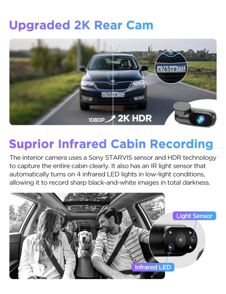 | ФУНКЦИИ | 5GHz Wi-Fi Auto Event Detection Bluetooth G-Sensor GPS Loop Recording Parking Mode Smart Voice Control ; Notification Time Lapse Recording Upgraded Infrared Cabin Recording |