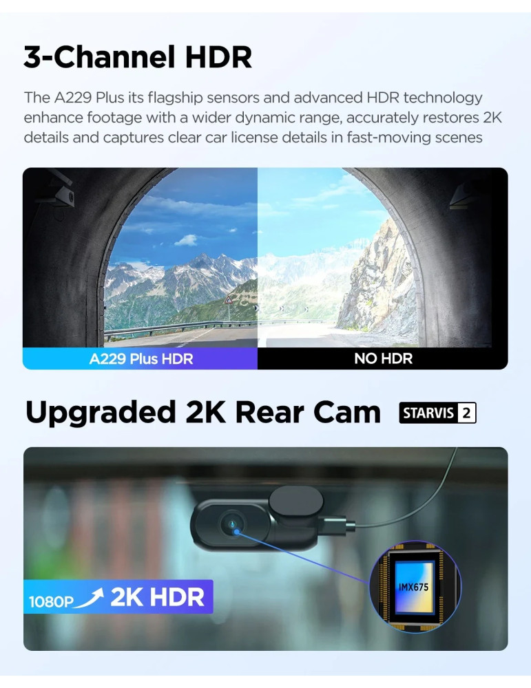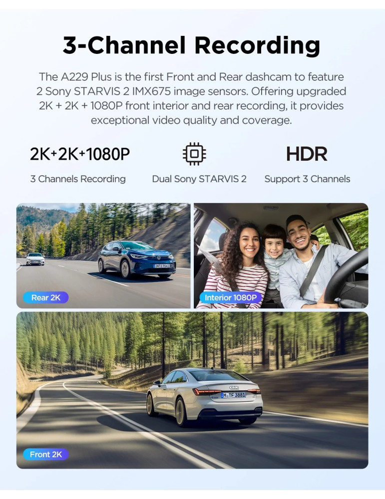 | ДРУГИ | 2K+2K+1080P - 3 Channels Recording Dual Sony STARVIS 2 Parking Mode Smart Voice Control ; Notification Super Night Vision 2.0 Ultra Fast 5GHz Wi-Fi Upgraded Infrared Cabin Recording |