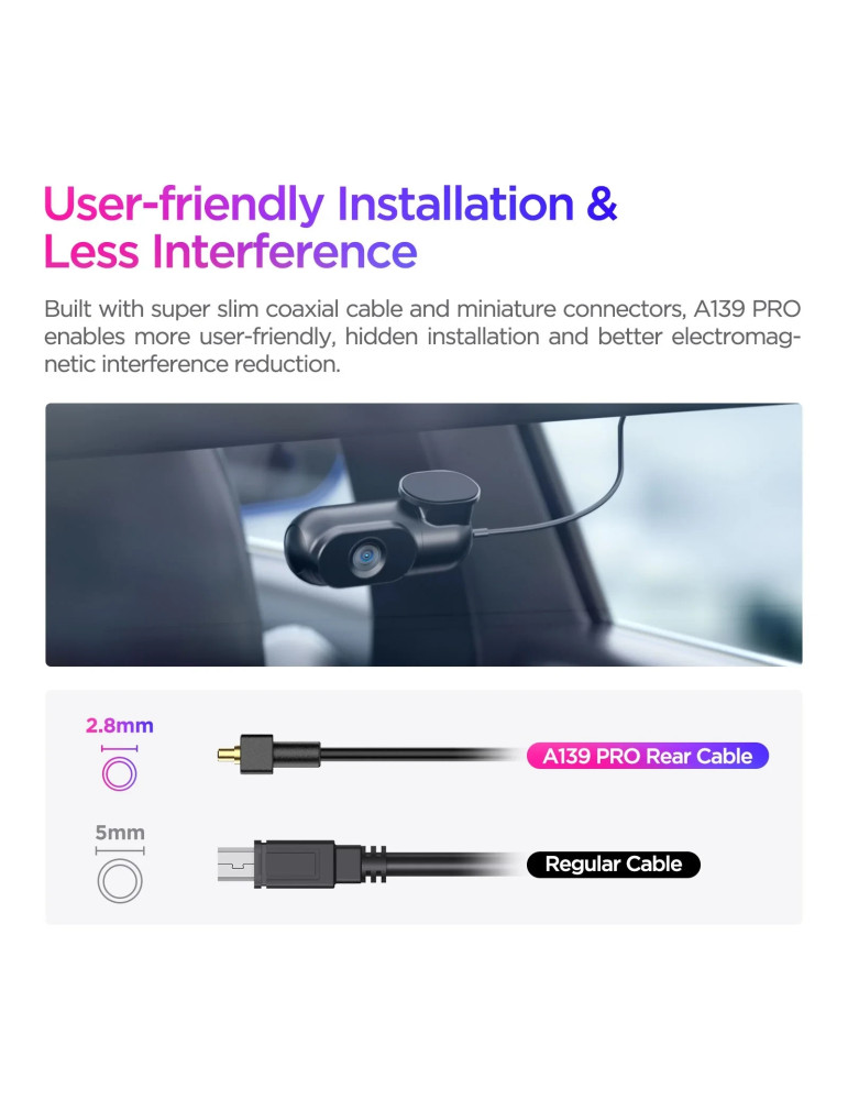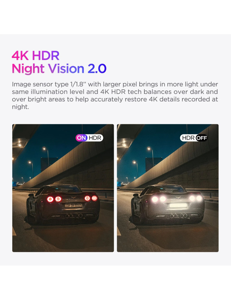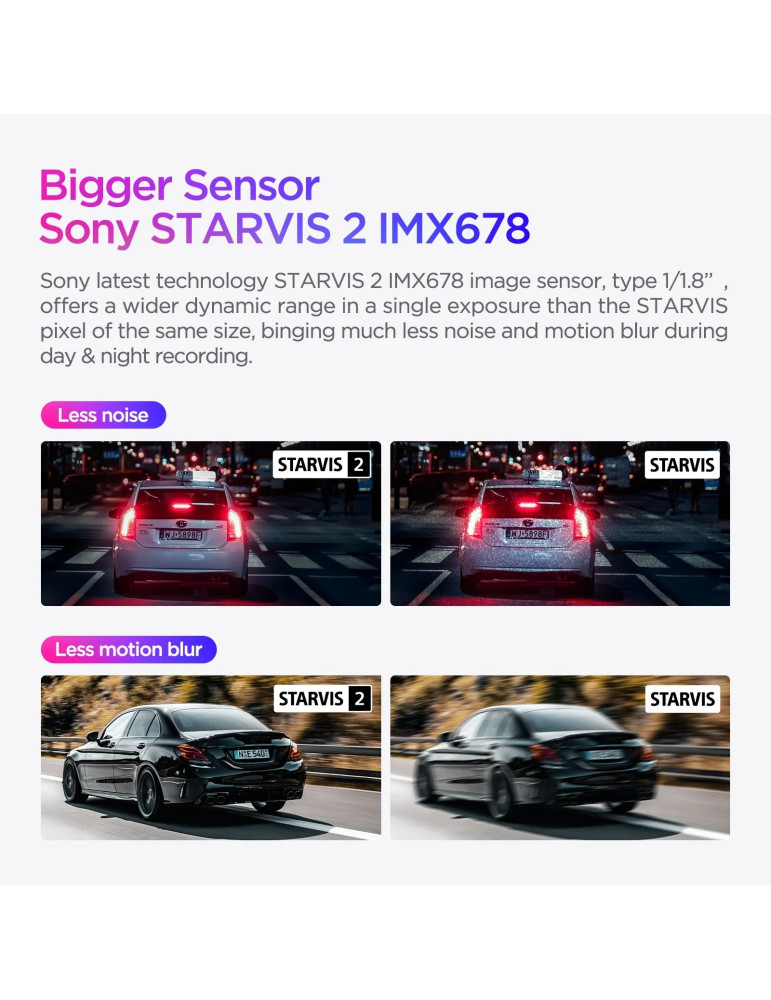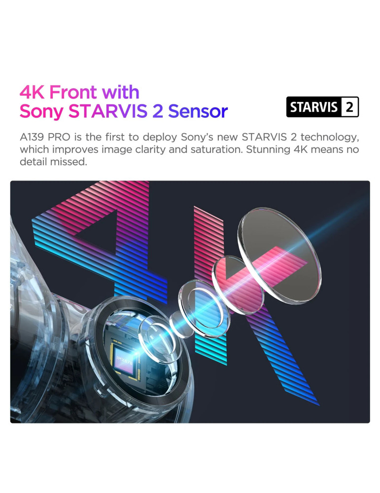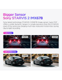 | ДРУГИ | Chipset Novatek 96687 Front: Sony STARVIS 2 Sensor 8MP 1/1.8 IMX678; Rear: Sony STARVIS Sensor 2MP IMX291 NO battery, use capacitor, 5V 2A Rear Dash Cam Included Storage: Up to external 512GB microSD Card |
