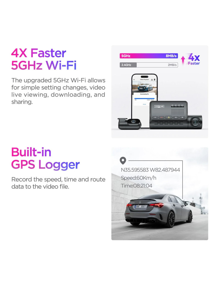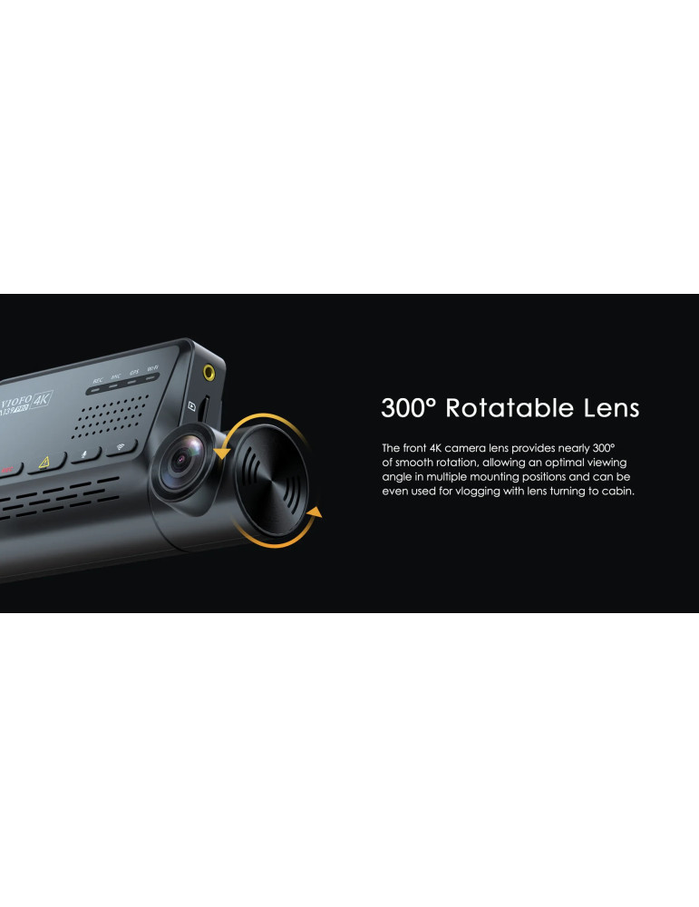 | ФУНКЦИИ | 4K Ultra HD Recording 5GHz ; 2.4GHz Wi-Fi 300 degree rotatable lens Bluetooth Buffered Parking Mode GPS Logger Infrared Cabin Night Vision Super Night Vision 2.0 Voice Notification |