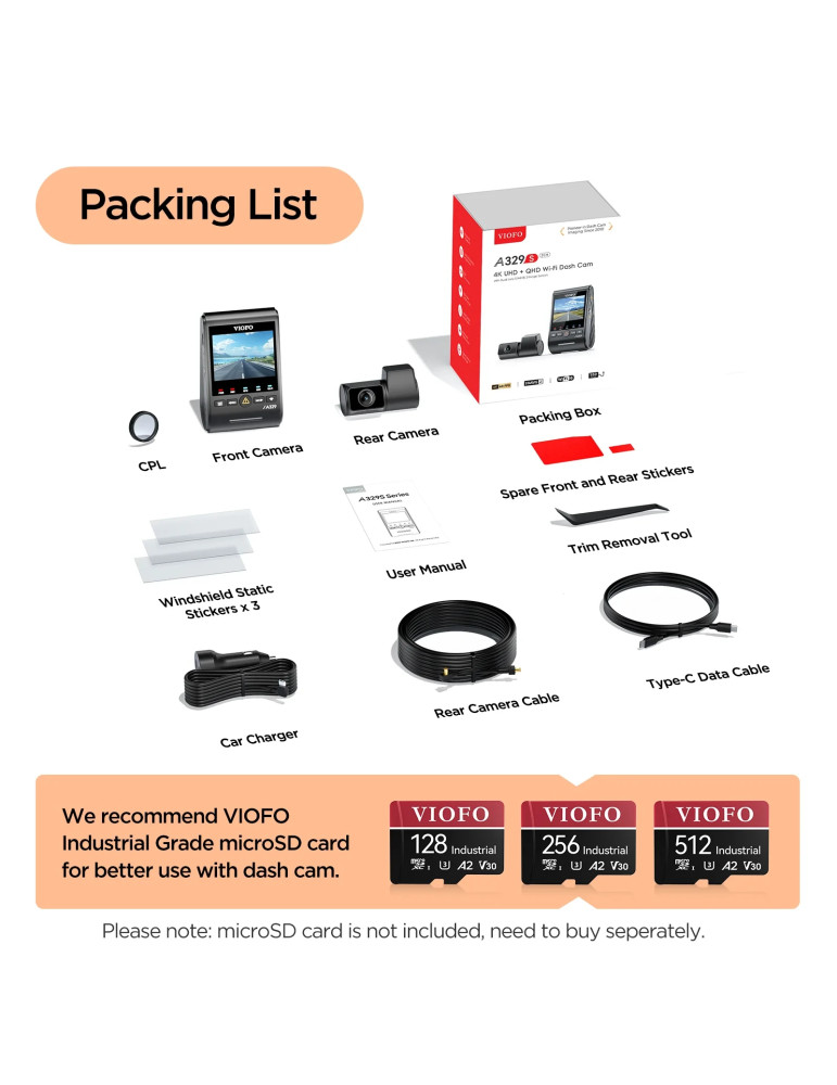 Видео регистратор VIOFO Dash Cam A329S 2 Channel - 4K, HDR, Dual Sony STARVIS 2, GPS, Bluetooth, Wi-Fi 6 - VIOFO-A329S-2CH