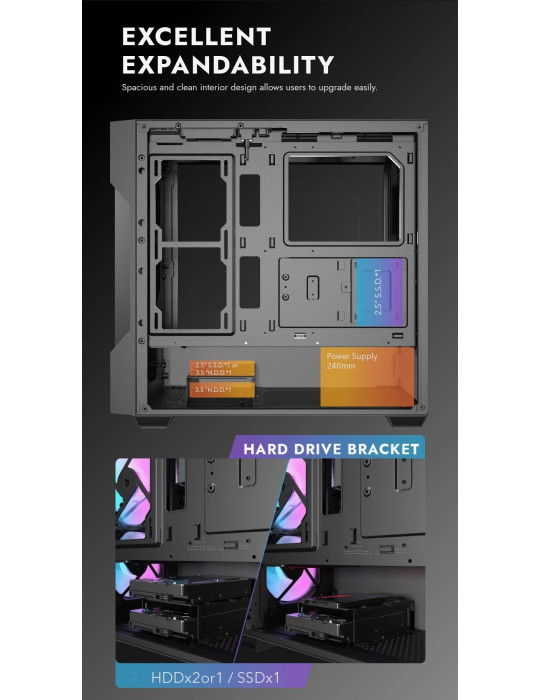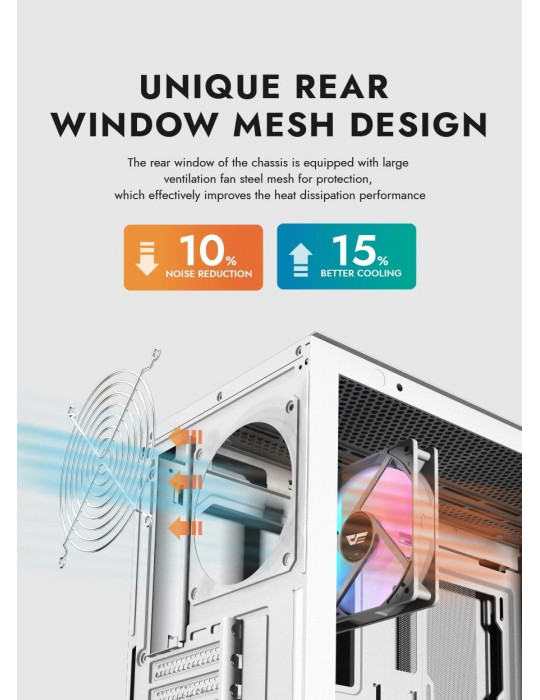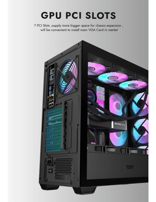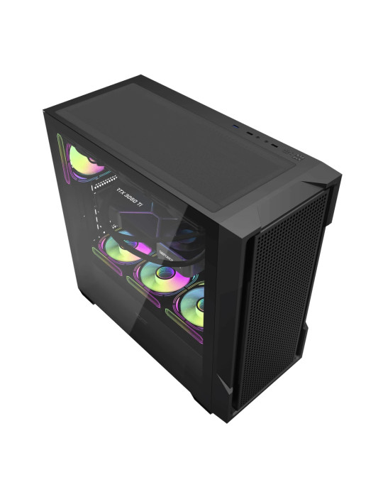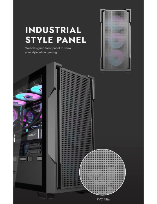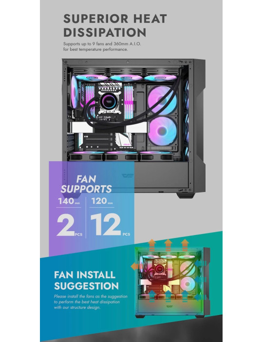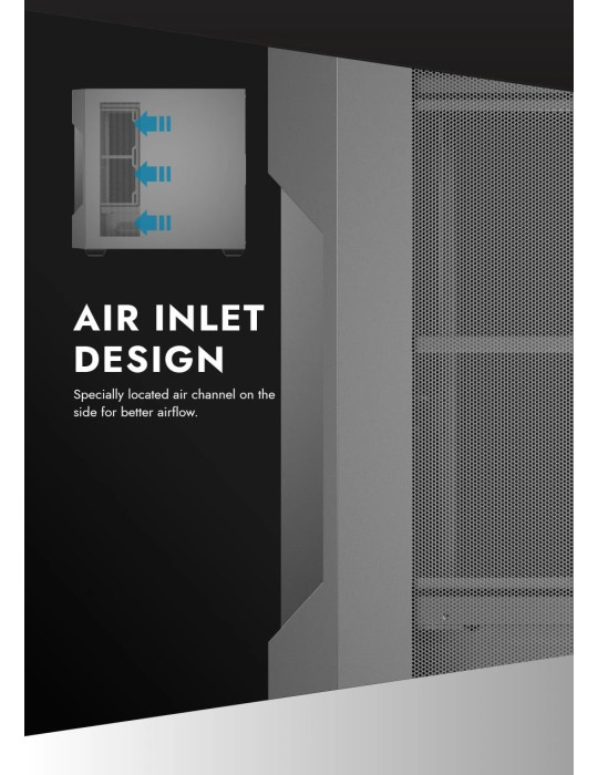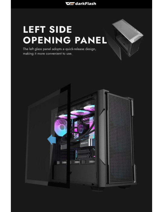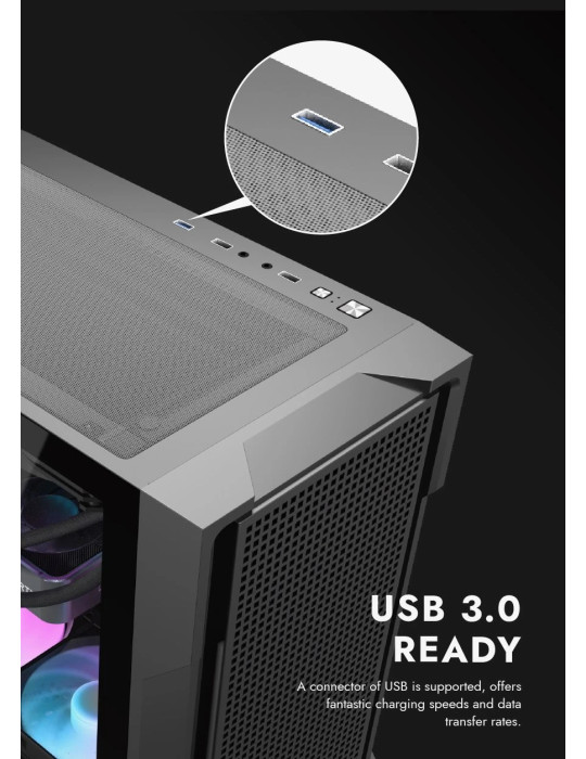 ДОПЪЛНИТЕЛНИ | Left side opening panel with quick-release design Mesh Panel design maximizes the airflow Support up to 9 fans and 360mm radiator USB 3.0 Ready |