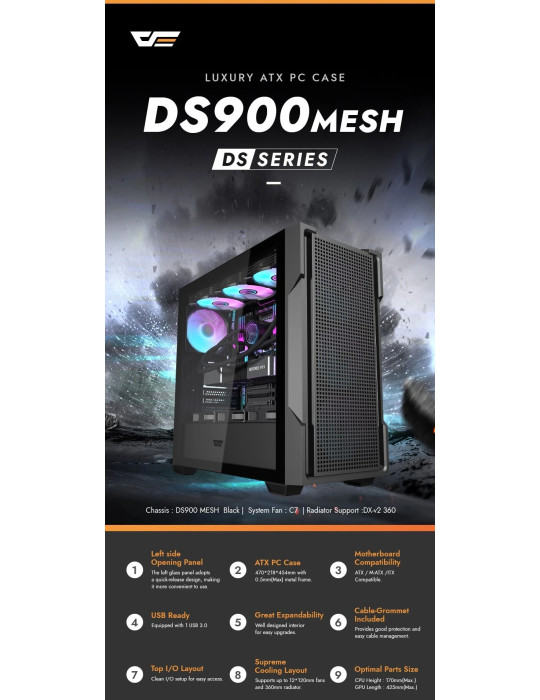 Кутия за компютър Darkflash DS900 Mesh Black - 4 x 120 mm A-RGB fans included - DS900-MESH-4F-BK