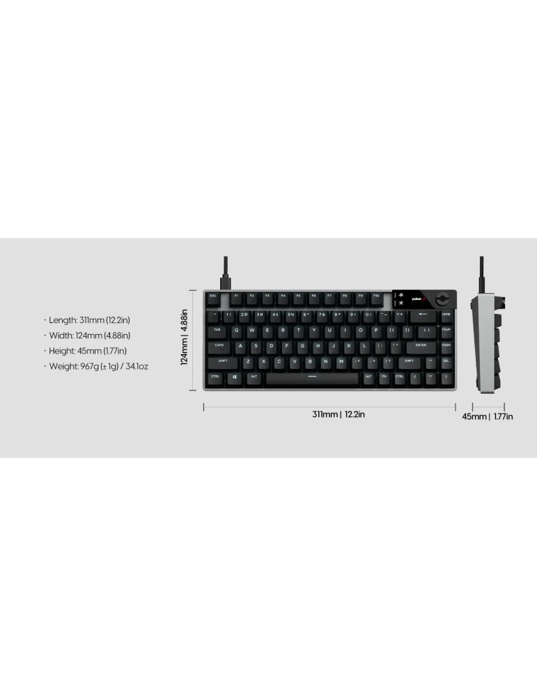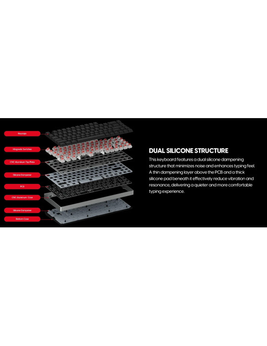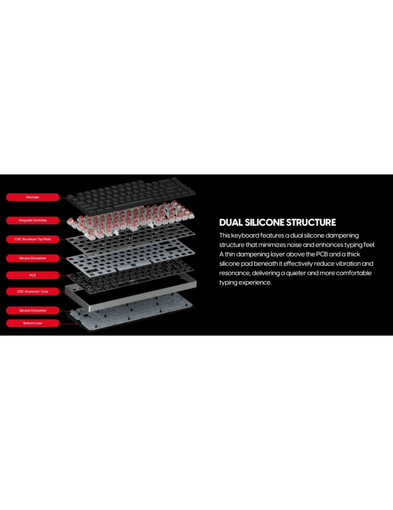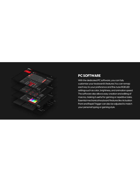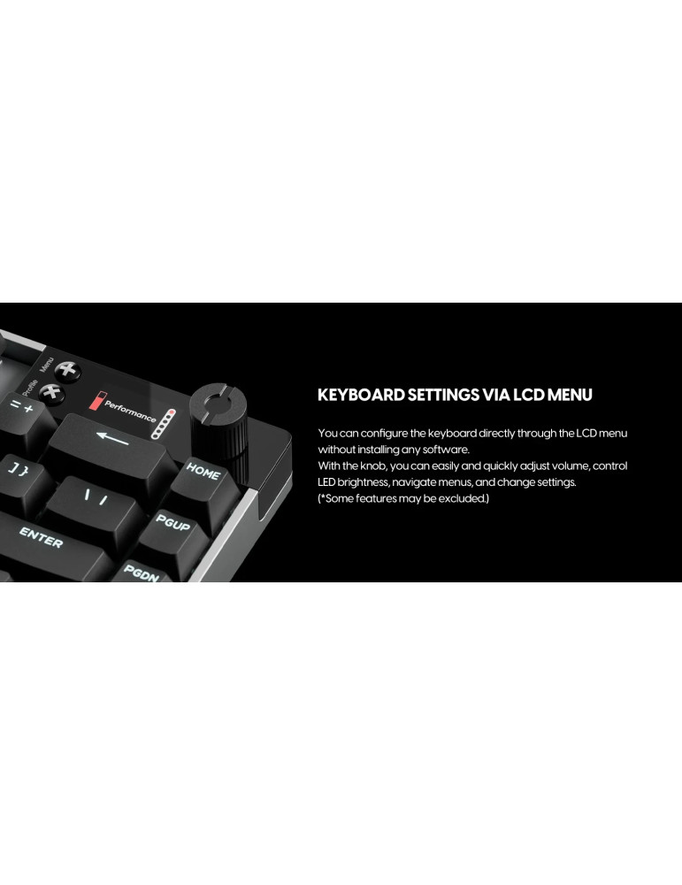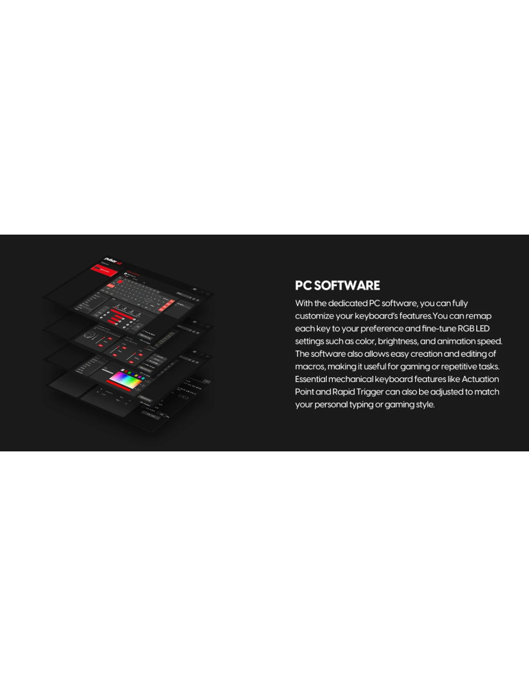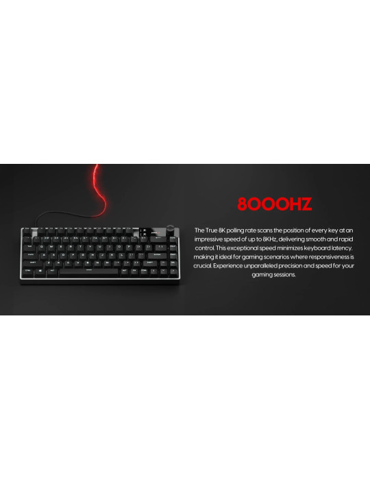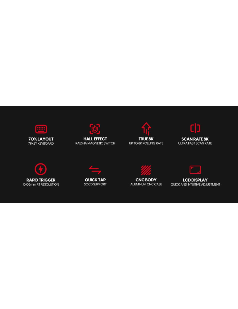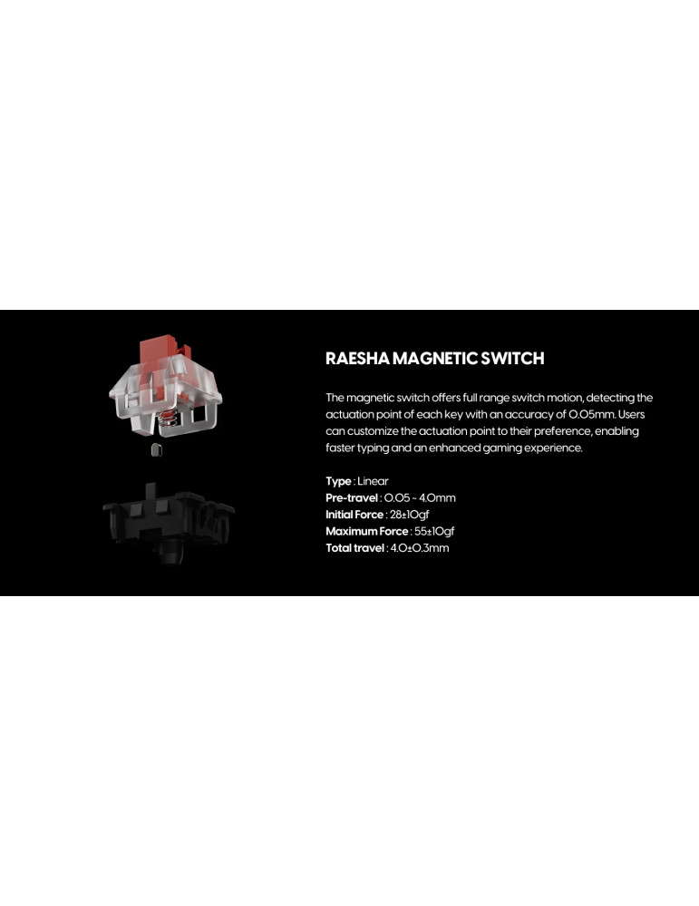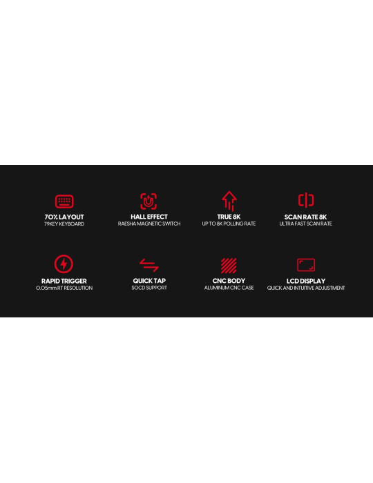 | ДОПЪЛНИТЕЛНИ | 4 Built in Profiles Adjustable Actuation Point Dynamic RGB Lighting Effects LCD Display : For quick and intuitive on-board settings Quick Tap (SOCD Support): Optimized for fast-paced gaming Raesha Magnetic Switch(Hall effect) Rapid Trigger: 0.05mm resolution for instant key reset True 8K Polling Rate ; 8K Scan Rate |