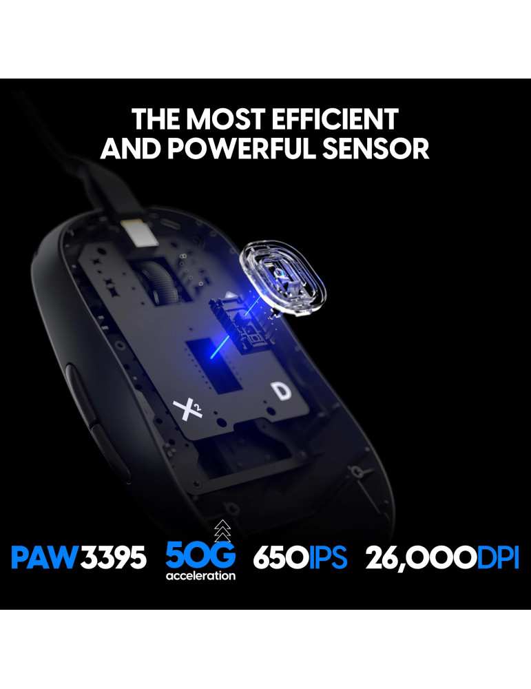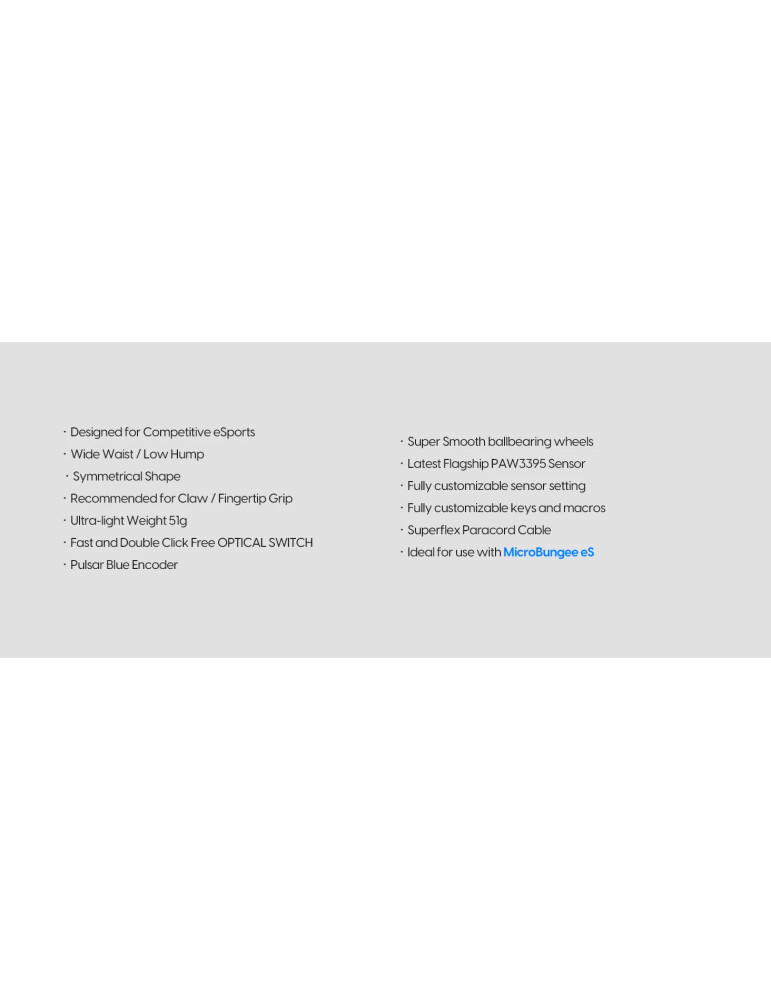 | ДОПЪЛНИТЕЛНИ | Designed for Competitive eSports Fully customizable keys and macros Ideal for use with MicroBungee eS Latest Flagship PAW3395 Sensor Pulsar Blue Encoder Recommended for Claw / Fingertip Grip Super Smooth ballbearing wheels Symmetrical Shape Wide Waist / Low Hump |