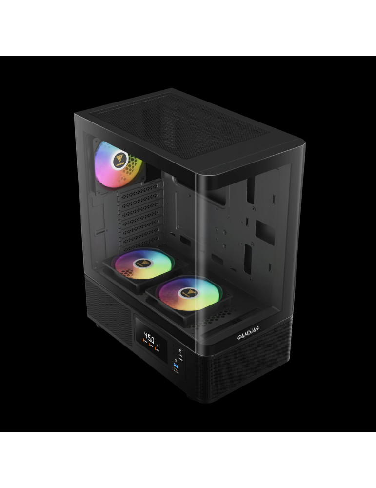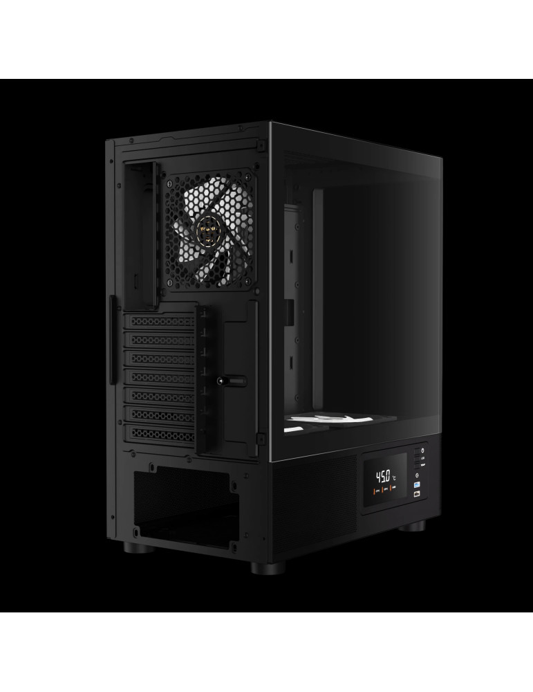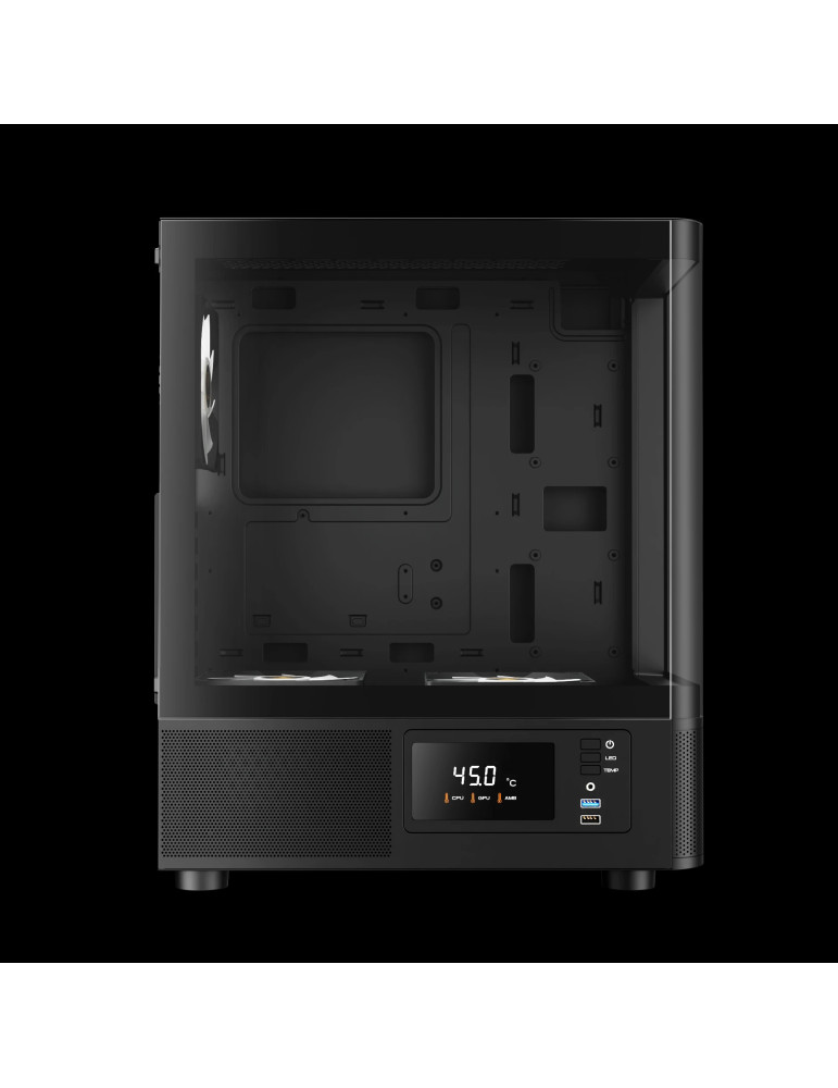 | ДОПЪЛНИТЕЛНИ | 3 Built-in 120mm ARGB Fans (2 x Reverse Intake Fans) Compatible with 340mm GPU Customized Monitor for System Information and Ambient Temperature Fits Mini-ITX, Micro-ATX, and ATX motherboards Magnetic Dust Filter Perforated Air Vent PSU Chamber Seamless Curved Glass Display |