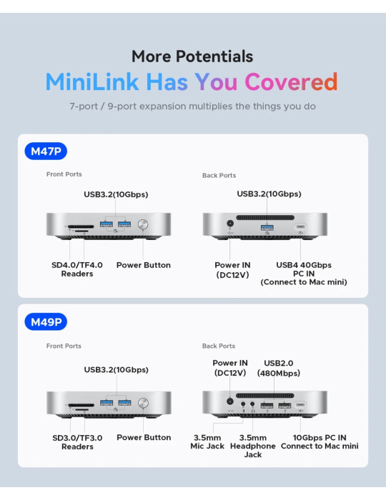 Докинг станция Orico SSD Docking station MiniLink M47P-EU-SV M.2 NVMe - USB4(40Gbps) x 1, USB3.2(10Gbps) x 3, M.2 SSD x 2, SD/TF 4.0 - ORICO-M47P-EU-SV-BP