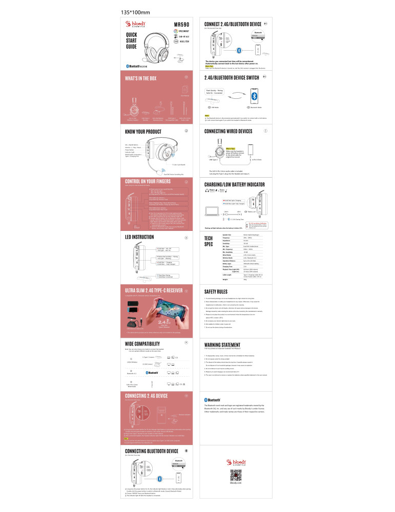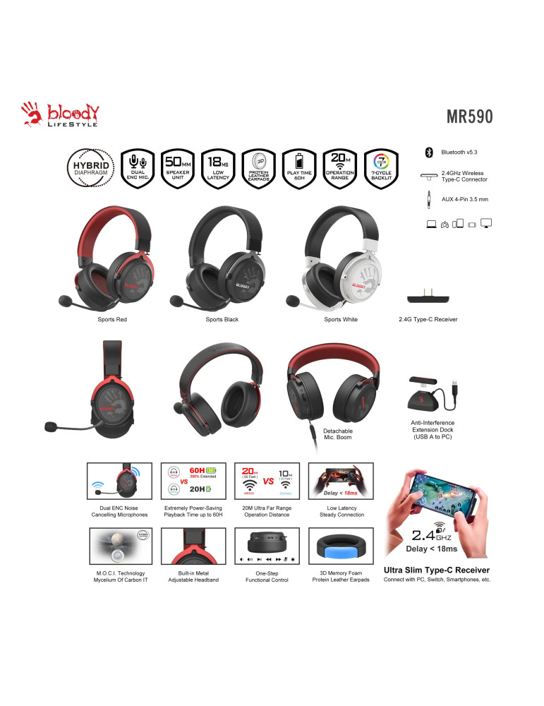 Bluetooth геймърски слушалки A4tech Bloody МR-590 с микрофон, Bluetooth 3.5мм жак, червен - MR590 SPORT RED
