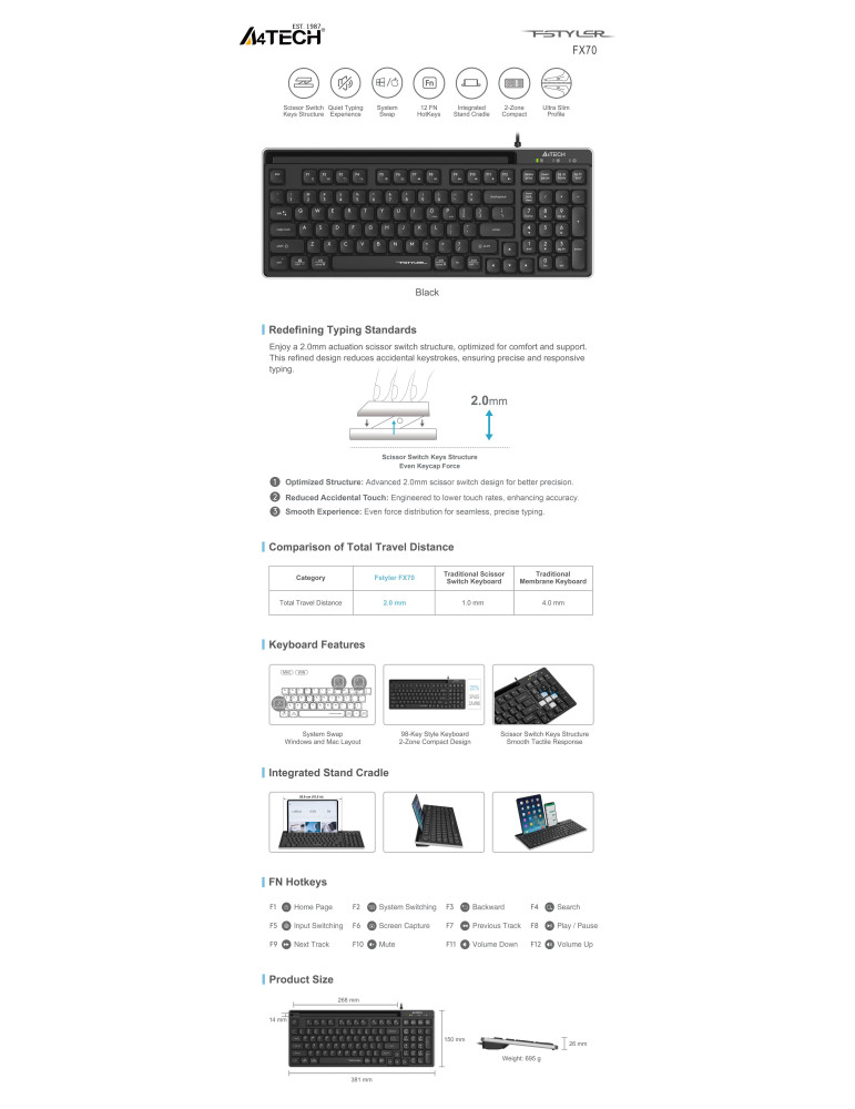 Клавиатура ниско профилна A4tech Fstyler FX70, ножична технология, кирилизирана, черна
