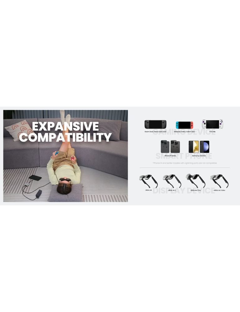 | Х-КА 1 | Power Play: Power up your gaming sessions and streaming while using XREAL AR glasses. Charge and play, so that your gaming adventures are never cut short by a drained battery again. |