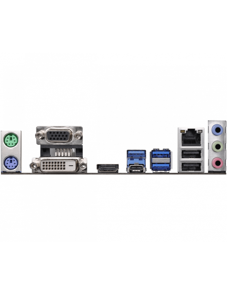| I/O | 1 x PS/2 Mouse Port; 1 x PS/2 Keyboard Port; 1 x D-Sub Port; 1 x DVI-D Port; 1 x HDMI Port; 2 x USB 2.0 Ports (Supports ESD Protection (ASRock Full Spike Protection)); 3 x USB 3.0 Type-A Ports (Supports ESD Protection (ASRock Full Spike Protection)); 1 x USB 3.0 Type-C Port (Supports ESD Protection (ASRock Full Spike Protection)); 1 x RJ-45 LAN Port with LED (ACT/LINK LED and SPEED LED); HD Audio Jacks: Line in / Front Speaker / Microphone |