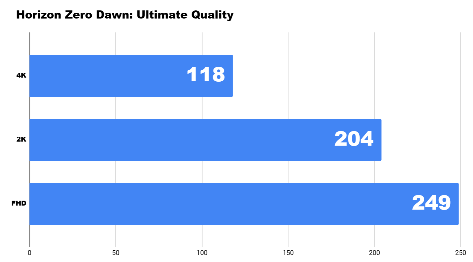 Следващото трипъл-А заглавие е малко по-старичко, но за сметка на това има хубав бенчмарк, който обичам да ползвам – говоря за Horizon Zero Dawn. Тук на Ultimate Quality може да видите, че и на трите резолюции се получават много добри резултати.