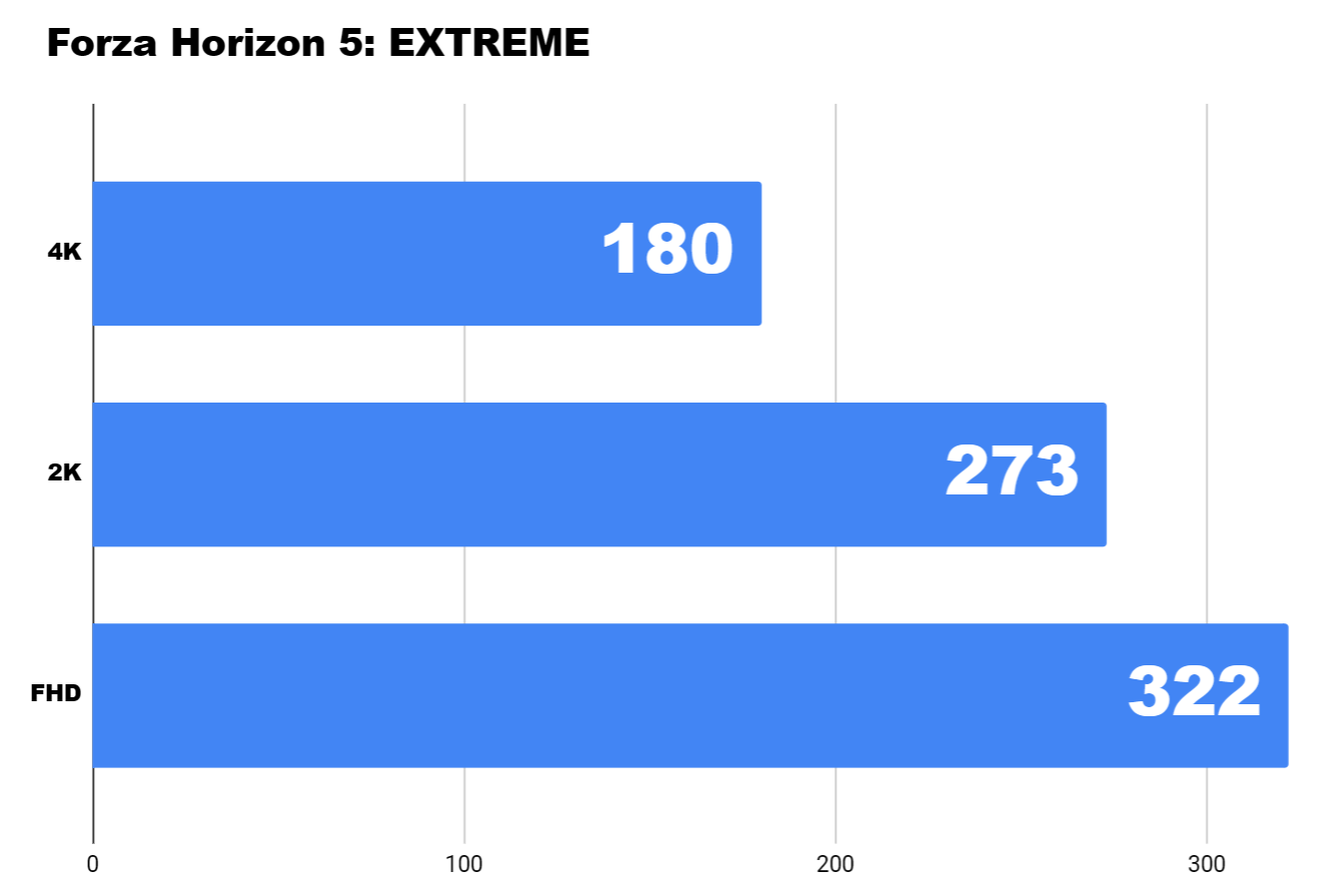 Forza Horizon 5 е игра, която вече реално ще играя на този компютър, тъй като е от любимите ми игри. На 4K и EXTREME пресет може да видите 180 средни кадри.