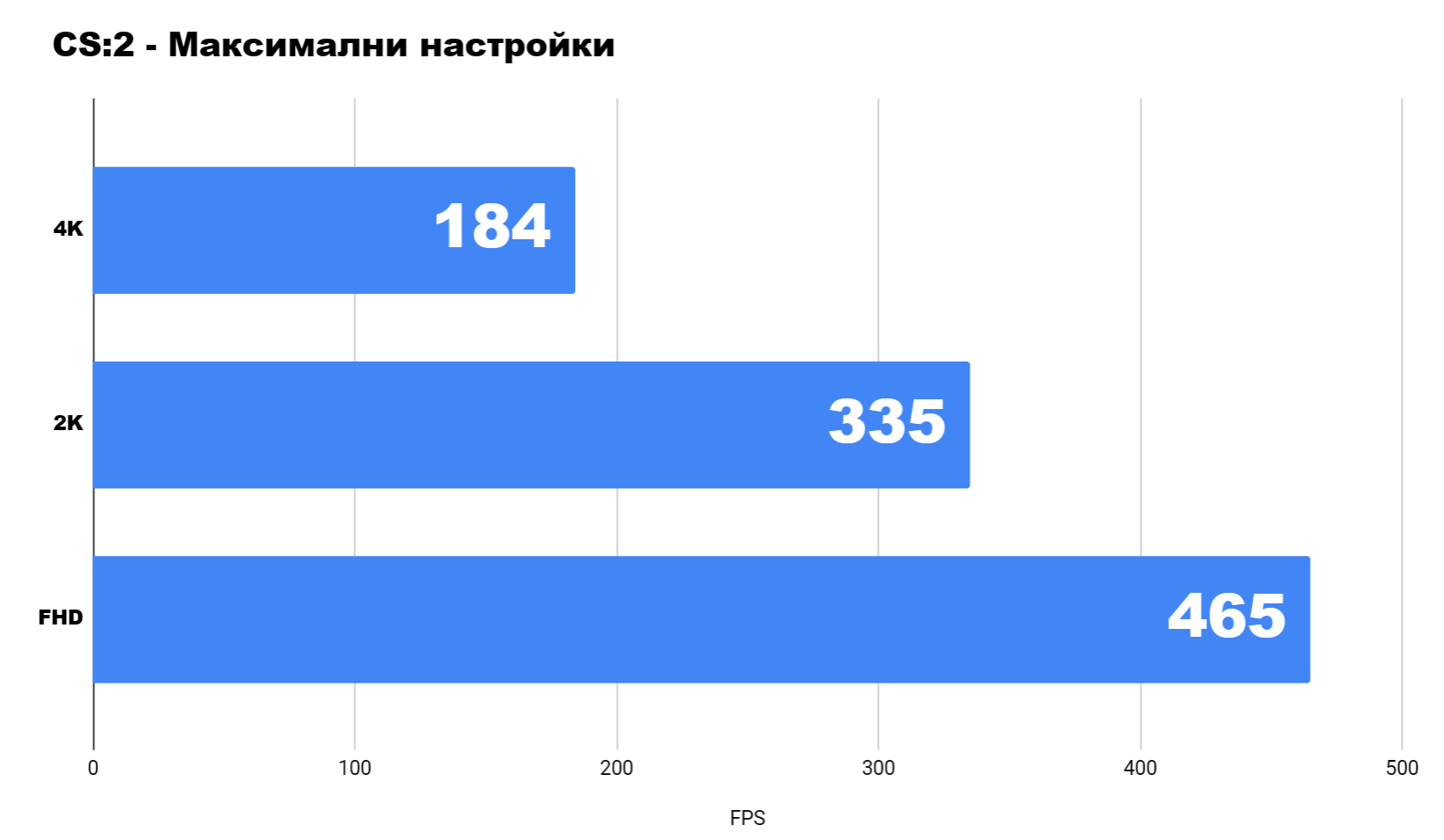 И за накрая съм оставил два състезателни шутъра – говоря за добрата стара CS, по-конкретно CS:2. Тук на 4K максимални настройки имахме 184 средни кадри, на 2K вече са над 300, и на FHD са над 400.