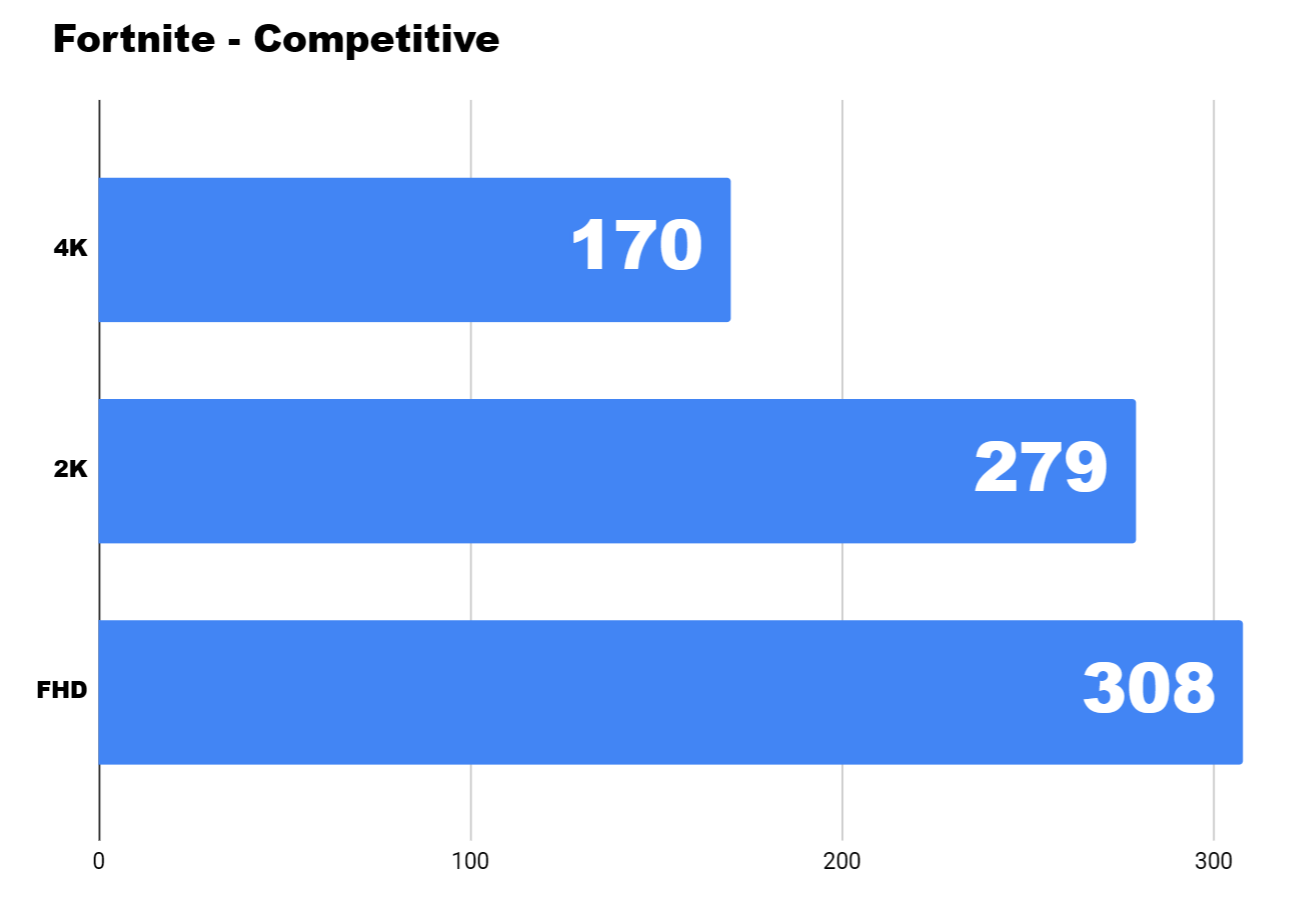 И накрая тествах любимата на цяло едно поколение Fortnite. Използвах Competitive настройки и получих подобни на тези при CS:2, малко по-ниски. На 4K имаме 170 средни – напълно достатъчни, на 2K вече са 279, и на FHD може да видите 381 – почти 400 кадъра.