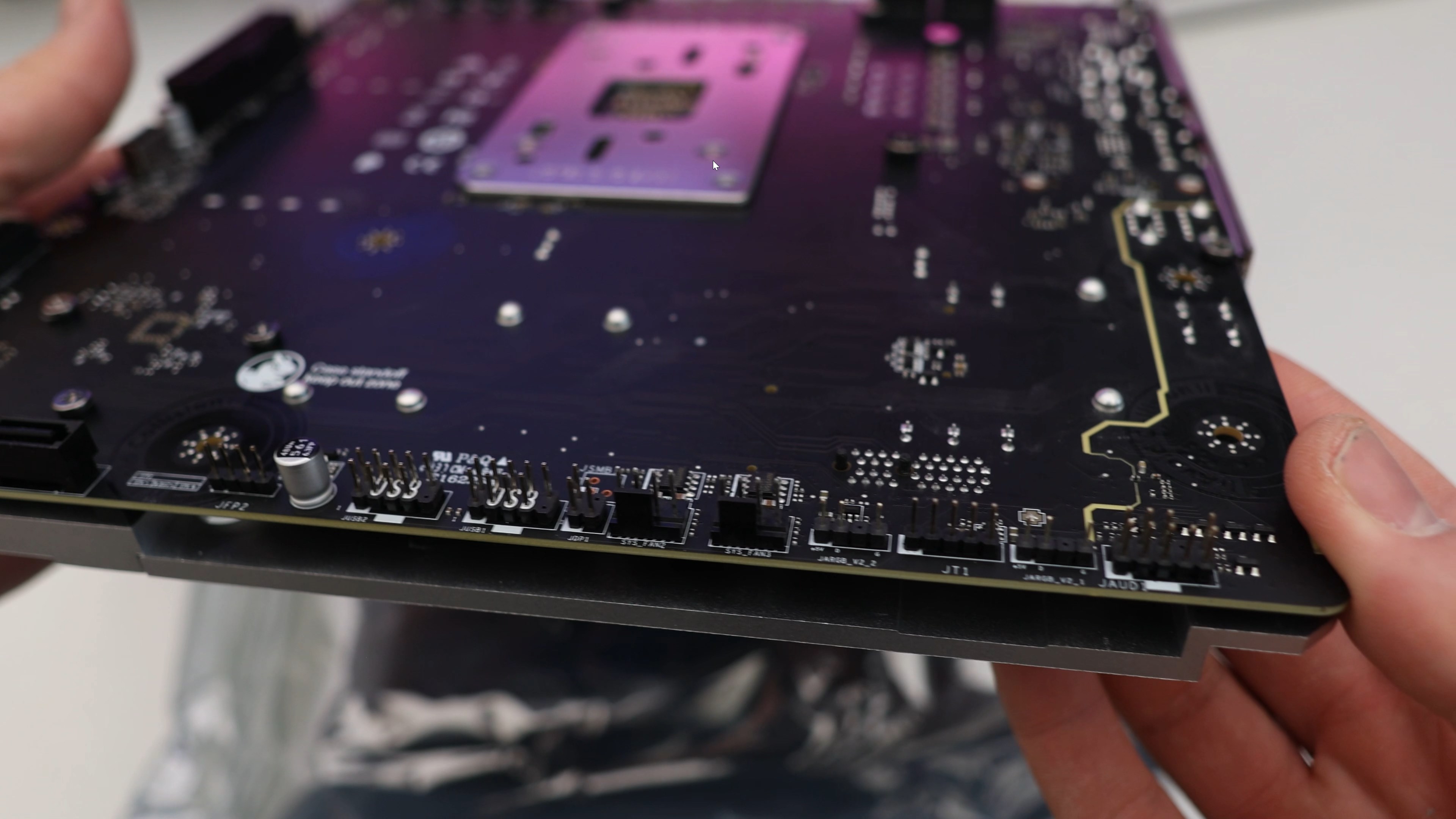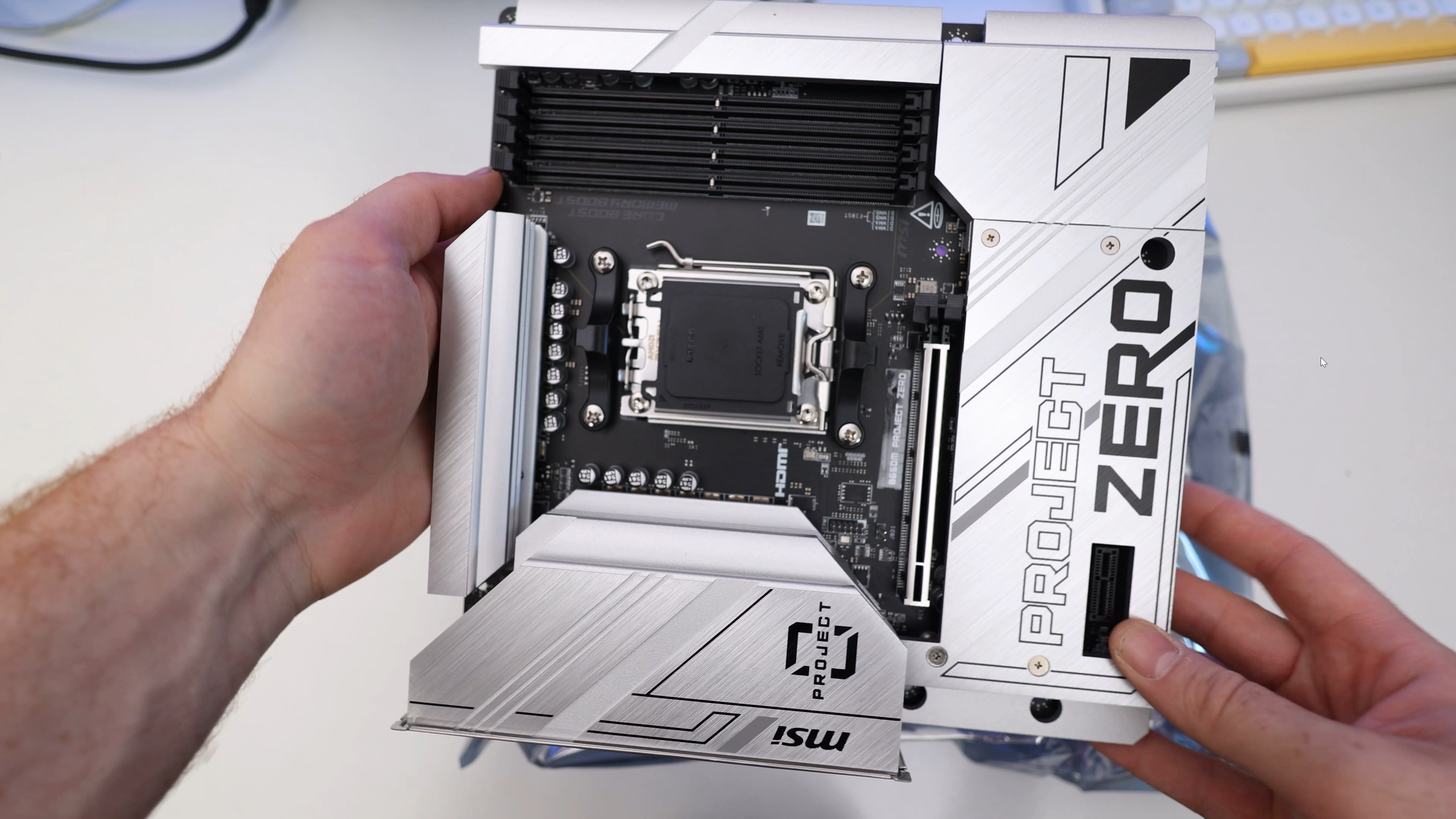 Това означава, че конекторите за кабелите се намират на гърба на дъното. Самият модел е Project Zero B650 на производителя MSI.